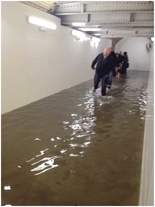 Passengers were forced to wade through ankle-deep water after heavy rain swamped a train station underpass. Dozens of people were left without any alternative after getting off the train at Earlswood Station and making their way down to the subway at platform two.