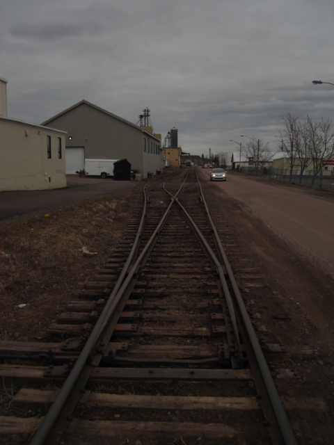 There really isn’t much change in the grade between the track and the nearby road. For much of the length of this spur, this is the case. For the modeller, life gets much simpler since we’re laying track on the same deck as the roadway with little or no need to raise the track on cork or a similar roadbed product. On a model railway, my temptation would be to perhaps arrange the scene so the front edge is centred on the roadway. Note that while the track and road are close to the same elevation, the land does slope upward as you move deeper into the scene. Speaking of elevation changes, we’re looking down this spur and at…