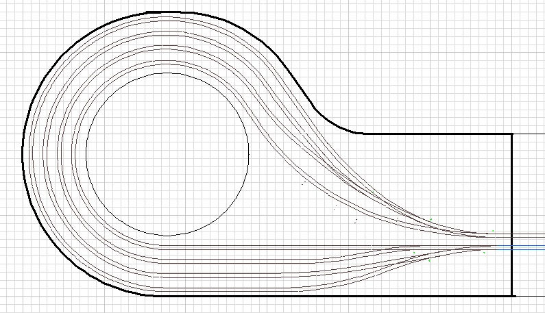 What form should this staging take? The most compact approach would be a traverser or sector table. But unless I build a train turntable with a centre pivot, there will be a lot of shuffling of locomotives and cabooses. So I played with 3rd Planit for a while and came up with the end loop layout below.