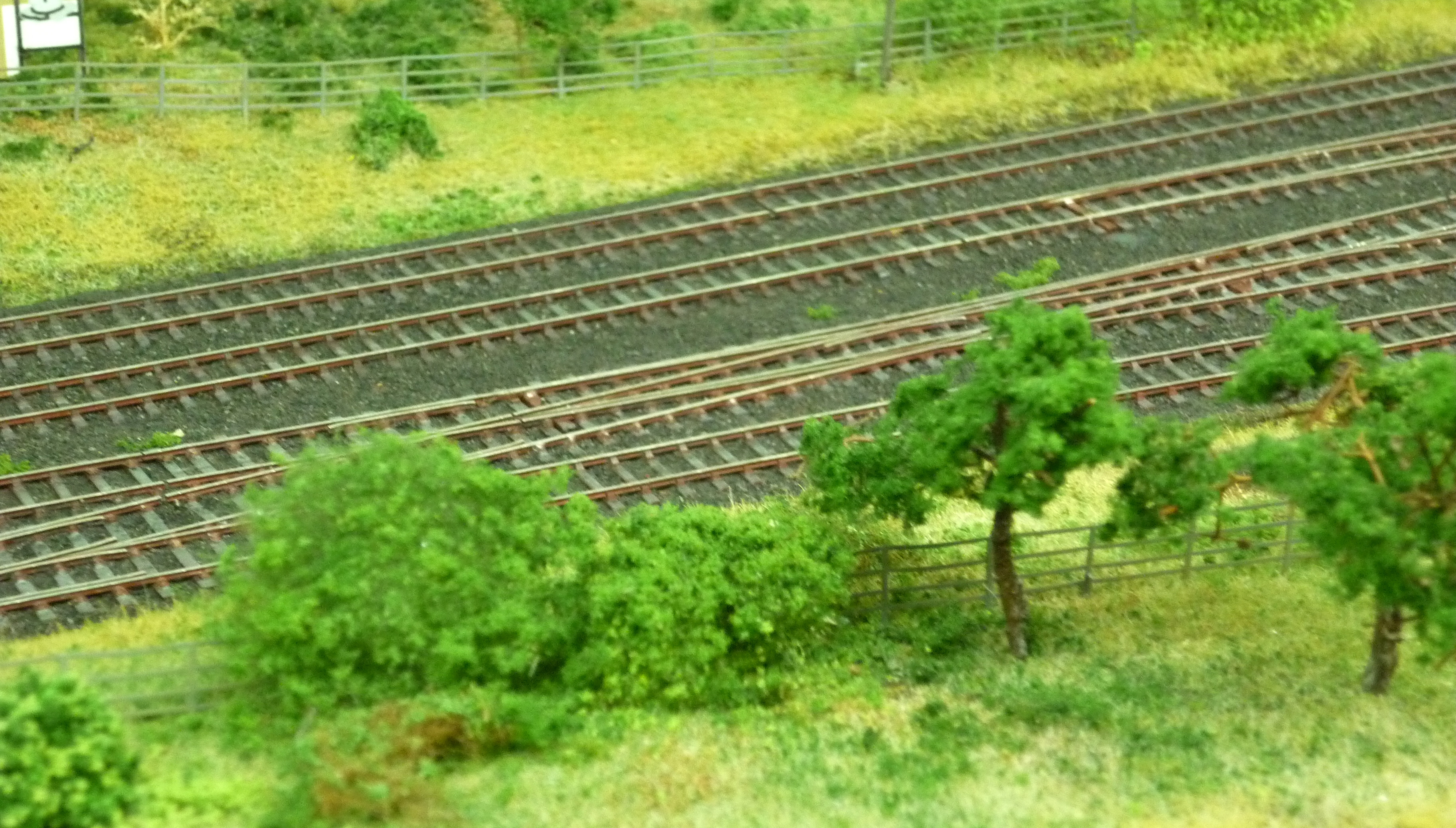 In the end, what makes this layout special is the finescale track. It’s difficult to see that the complex pointwork below is 2mm scale (especially when the trees and fences are also so very well modelled). Having said that, it’s not so much the narrow clearances at point blades and frog that are noticeable, rather it’s the scale rail section. With code 40 ‘N’ gauge track now available commercially, and most modern stock will run on it OK, it would be possible to get close to this in ‘N’ gauge.