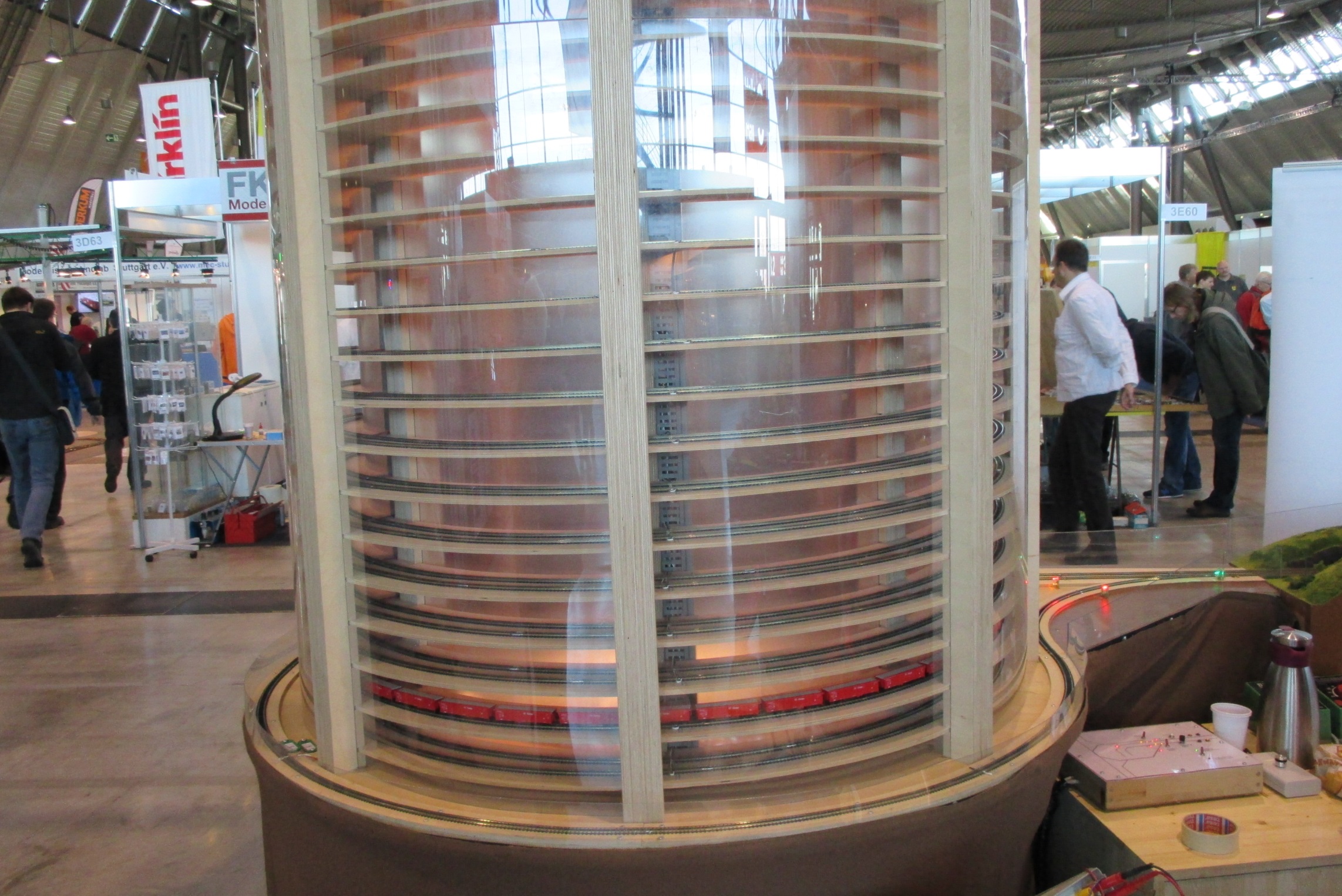 The ‘helix’ is always a focal point of the show. Two of these modules raise the running lines above head height, and enable the public to get ‘inside’ the modular layout, or just to form a main corridor through the layouts. It is also the focus of attention when a train gets stuck or derails near the top, requiring a step ladder and stopping all running for a while. At least this year there were no breakaways coming back down the spiral at ever increasing speed.