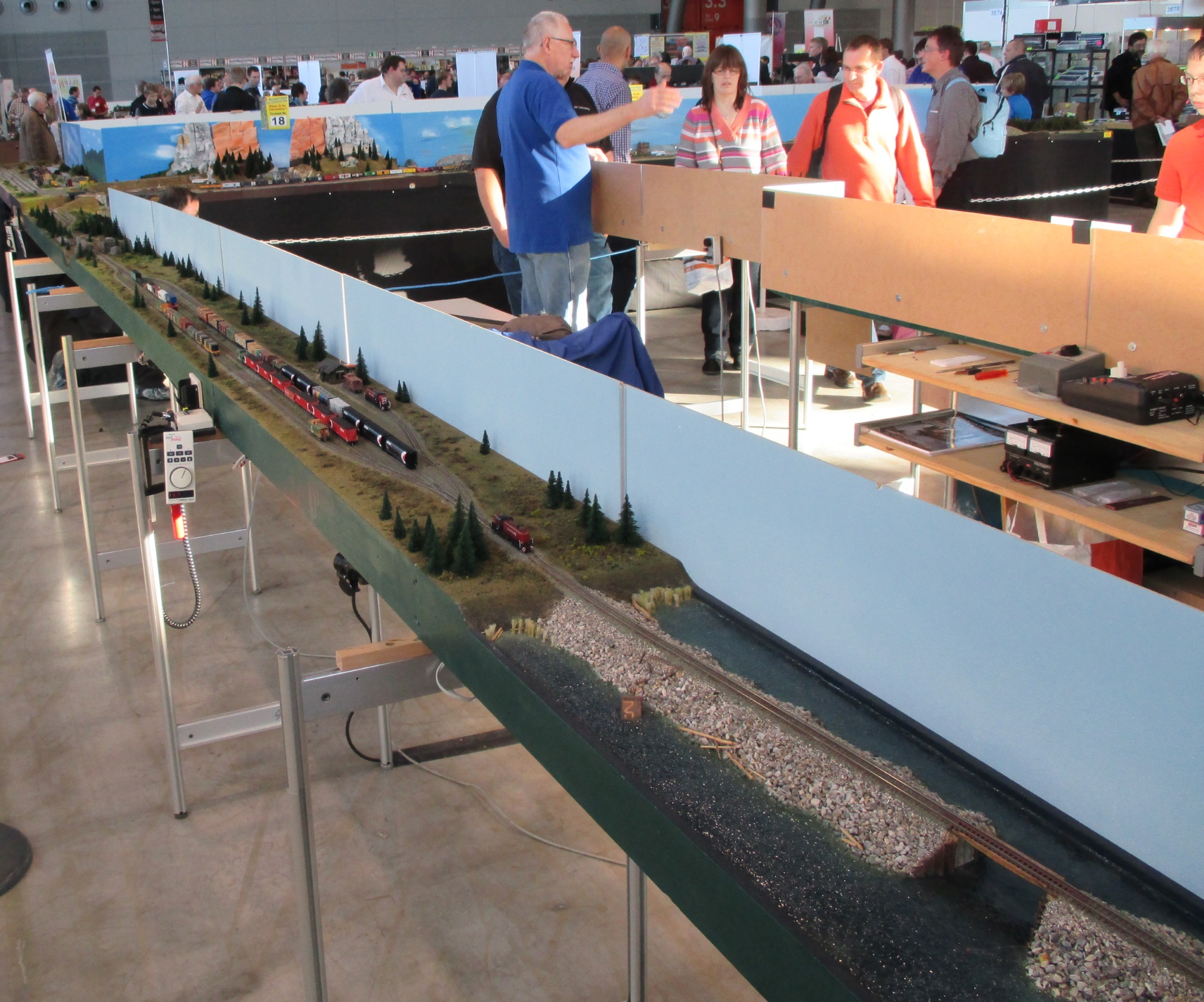 The main American layout was an N-trak circuit. This three-track module system has been connected to the N-club modules some years, but this time it was an independent display. This allowed a little super-power to be on display, with five units heading a 150 car goods train.