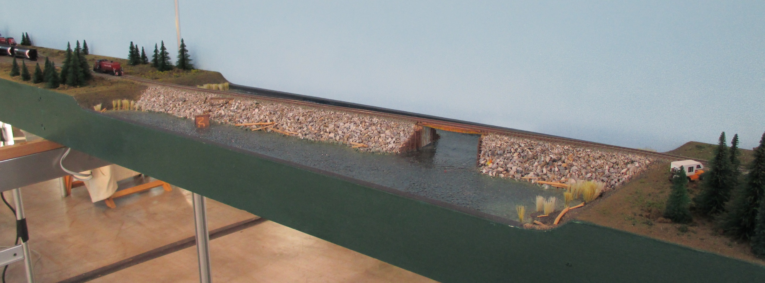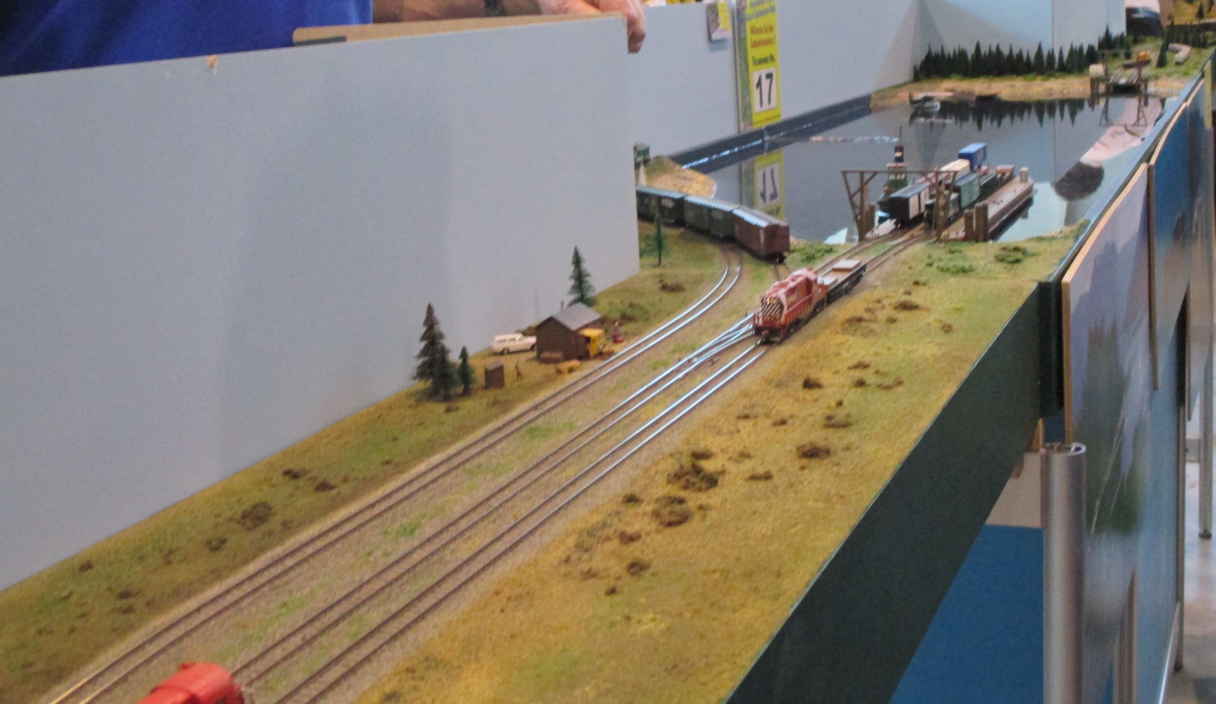 But my favourite layout was a Canadian Pacific based model, logically situated on the Canadian Pacific coast. This ticked all the boxes for me. It had a simple design, with long narrow modules, plain scenery but with well modelled focal points – look for the bear, the afters from a train crash, the wood chipping plant and the bridges and causeway below.