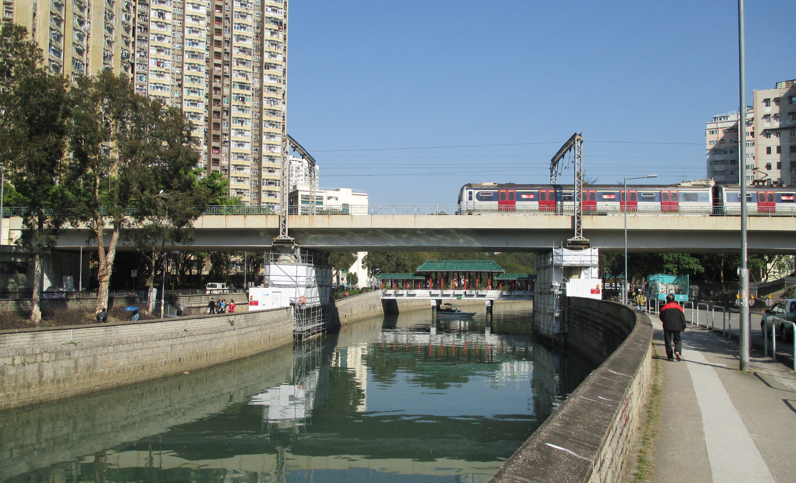 I took the Kwun Tong line MTR to Kowloon Tong and changed trains onto the ‘main line’ – the old Kowloon to Canton railway. Once the KCR, this section of HK railways became part of the Mass Transit, MTR, in 2007. I then took the KCR train north to Tai Wo station. The next picture is a KCR line train crossing the Lam Tsuen river.