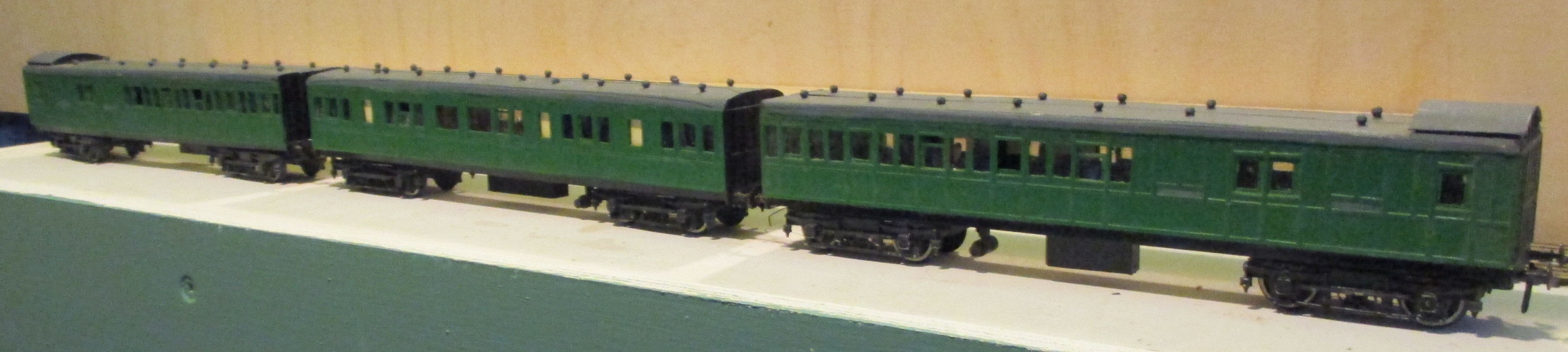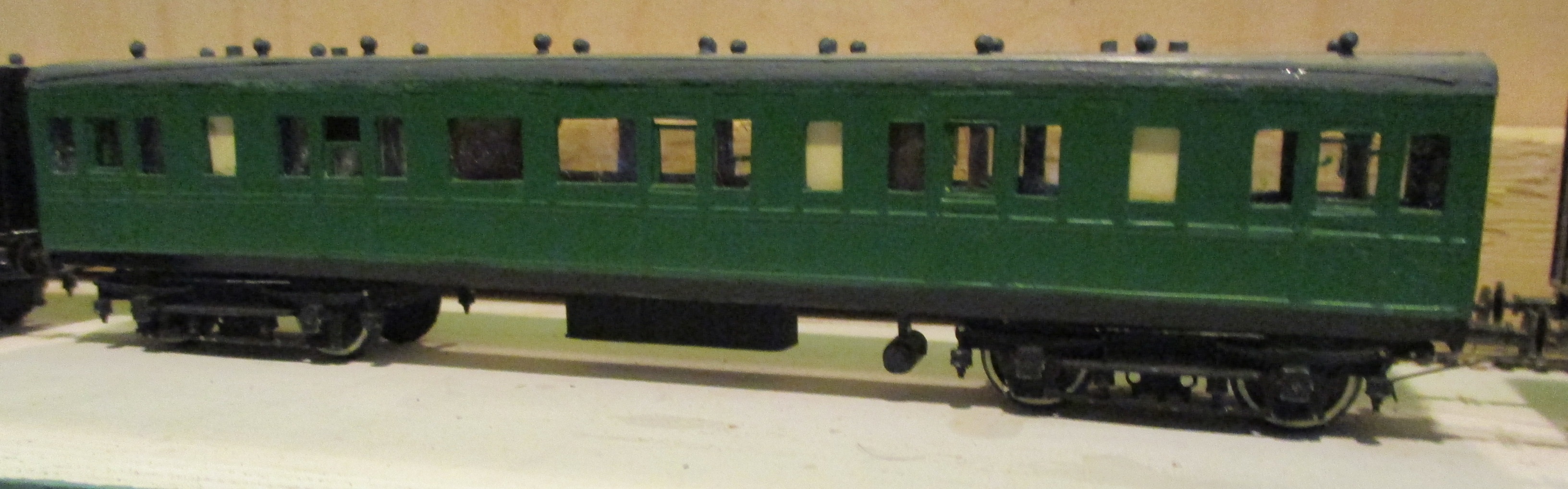 Next a BSL Maunsell brake coach. This was from a BSL kit (later Phoenix), with aluminium sides and cast ends, and a plastic roof. This made up into a very nice model, that I am going to keep. I was very proud (and probably still am) of the window frames in brown, masked on the body and added after the green base was painted on. Not as much lining as the new Dapol version, but, hey, who’s worried, as I did it!