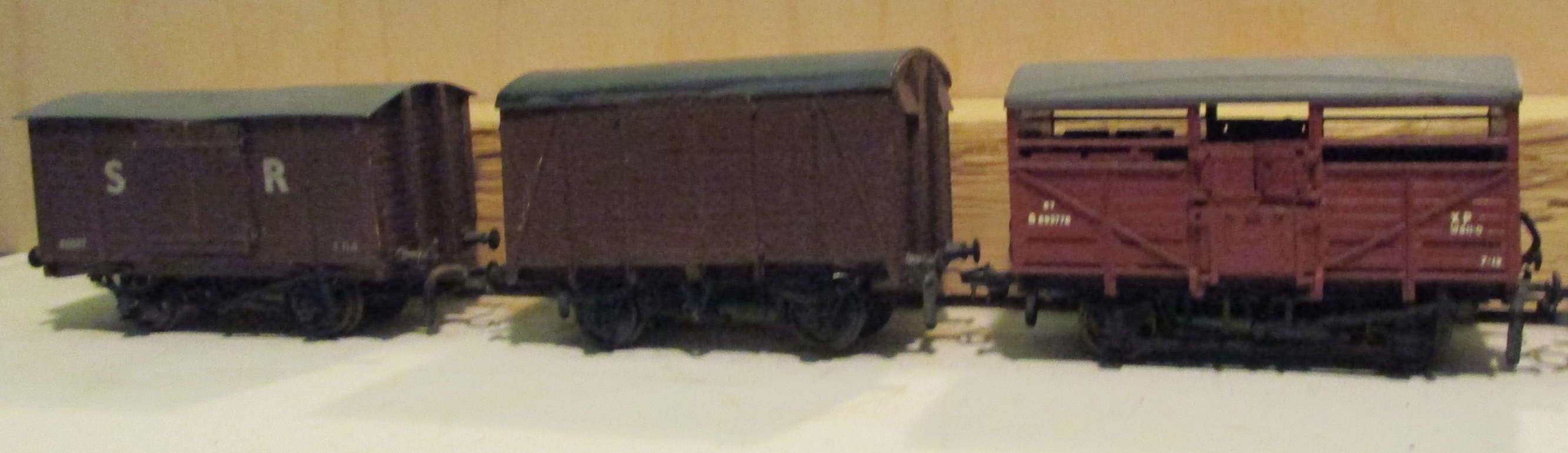 And as a PS, here are some wagons. A ‘Kenline’ printed card kit of an LBSCR van, an early Ratio plastic kit of the characteristic unequal planked Southern Railway van, and an Airfix BR cattle wagon. These early Airfix kits look very good, even by today’s standards.
