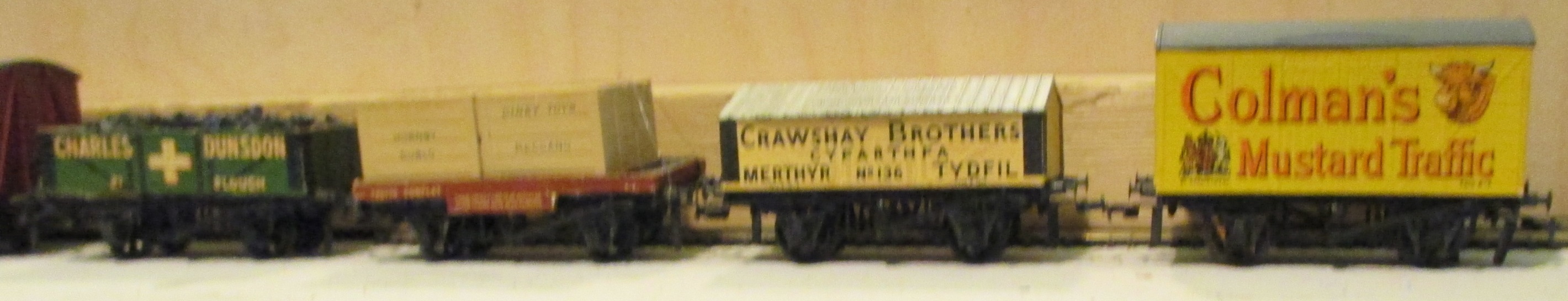 The second row is four Peco ‘Wonderful Wagons’. Very innovative kits for their time, with a cast body for weight, plastic (nylon) underframes giving very free running, and an embossed cardboard body to stick over the cast on. The end result lacked a little relief on the strapping, but was effective and a good way to add some colourful private owner wagons to your goods train.