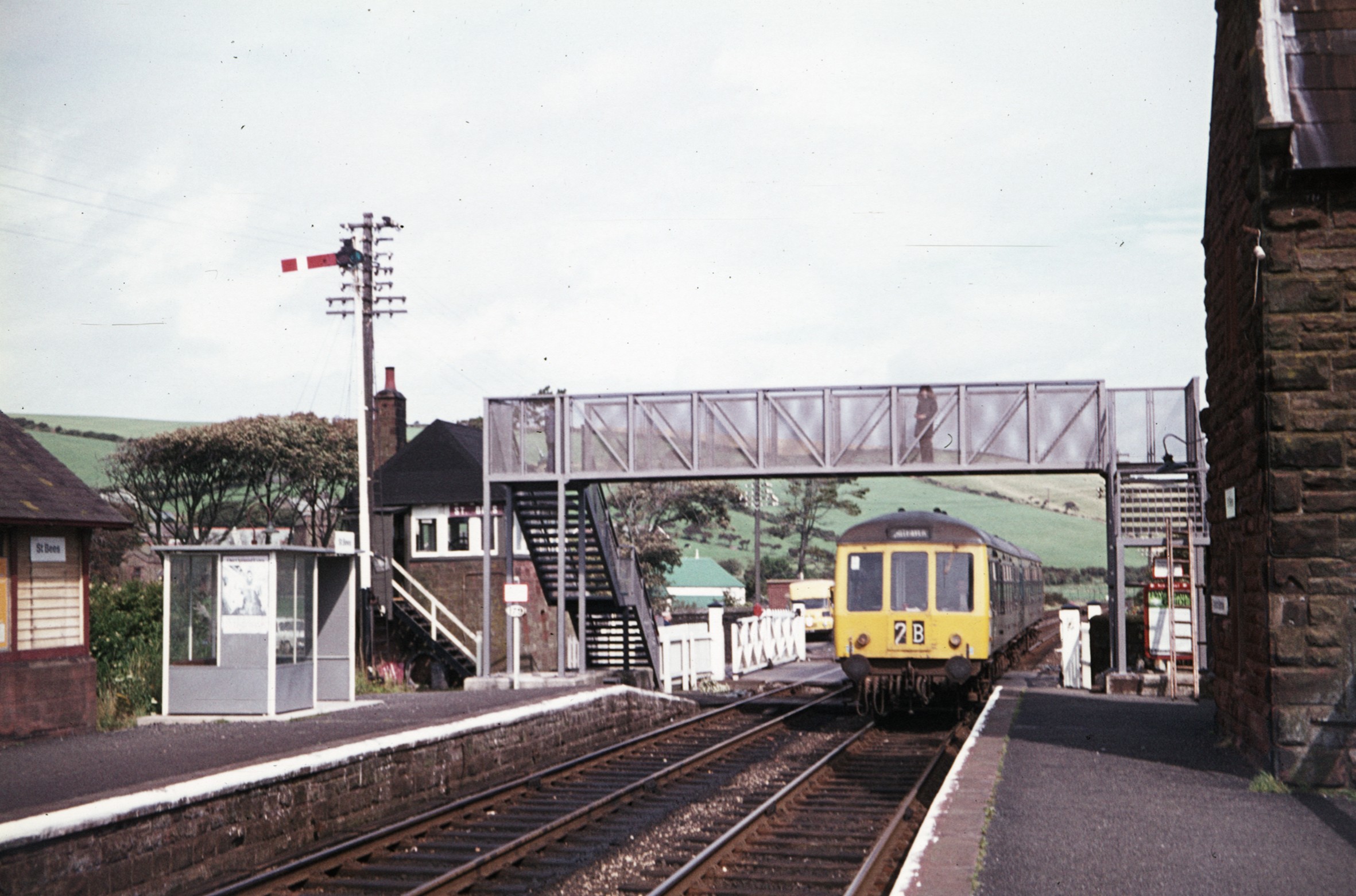 Is it just some quirk of the alphabet that two lines most at risk are the ‘Cambrian’ and the ‘Cumbrian’? I’ve stayed near both. I recall a family holiday in Barmouth, where the Cambrian line literally passed within inches of the hotel lounge window before crossing the road on an overbridge. Both hotel and railway were built up the side of the hill. A later holiday took me to St Bees in 1974, and here is a photograph of the station, with train arriving. An interesting mixture of period details here – the new footbridge and ‘bus shelter’ contrast with the semaphore signal.