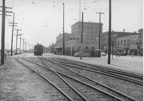 This aerial photograph from 1952 clearly shows the depot and a couple of interurbans standing close by. Most of the freight lines have been lifted and replaced by the inevitable car parks.