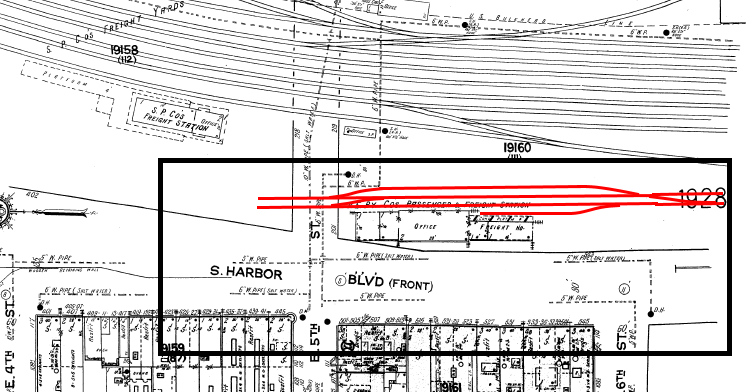 Of course, the full San Pedro station complex might be too large for a manageable model railway. But if we view the station from the harbour, it might just make a good N-club module. Here’s a view from the LA end of the station, showing the interesting track layout and the street beyond. (The depot and all the old structures have been demolished and redeveloped. Only the multi-storey municipal building remains.)