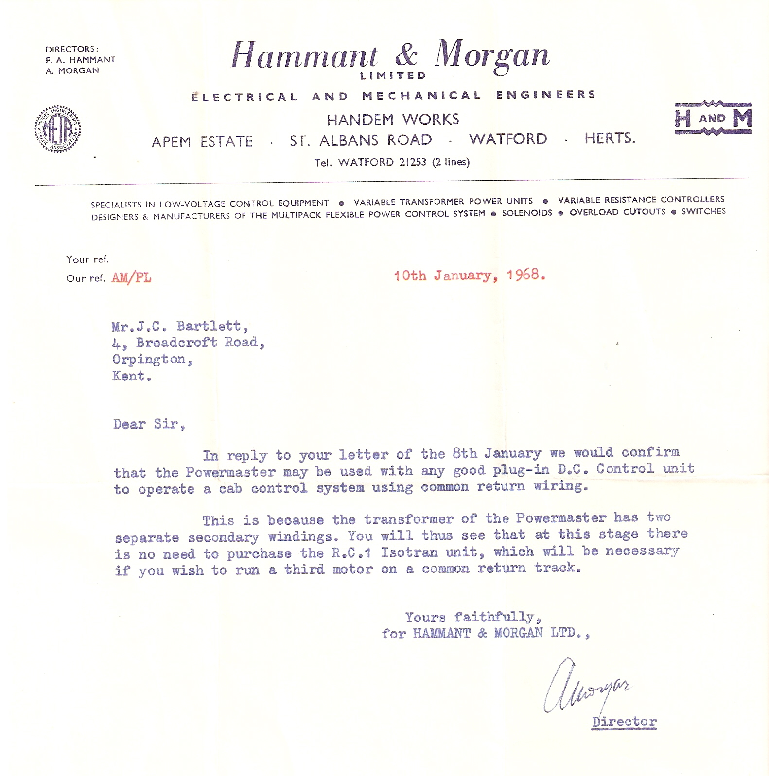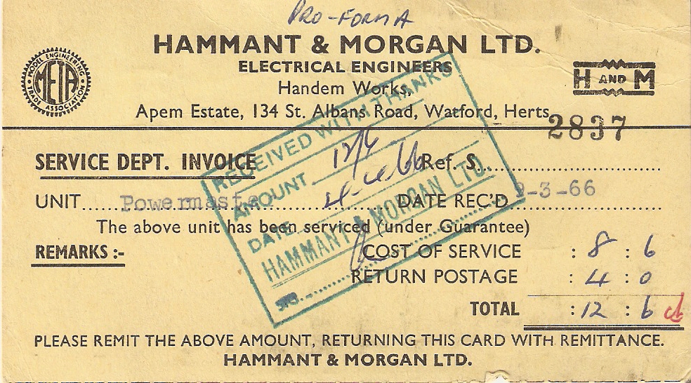 Then an envelope fell out of the book. It was a letter and postcard from Hammant & Morgan, makers of really good controllers for may years. The 3d stamp (just over 1p) had informed my father that we’d had our controller serviced for 12/6 (60p including postage). They must have done a good job, as 40 years later the same controller is still working and used for running my mini-drill and testing my modules.