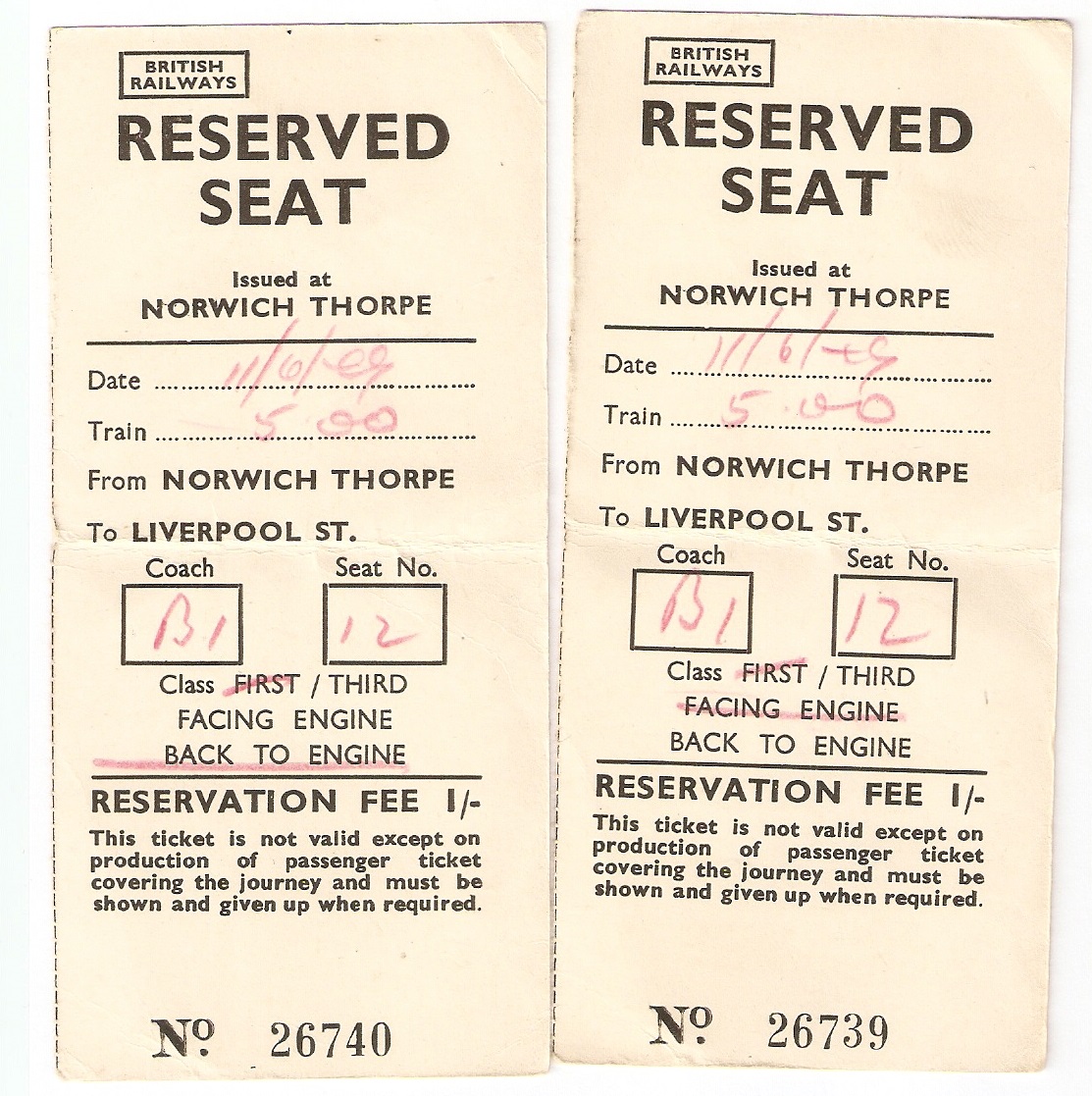 Then I came across this delightful find, tucked into an envelope. Two seat reservation tickets, to reserve seats from Norwich to London, on the day of the wedding. Note the massive fee of 1 shilling, or 5p in new money. These were issued by British Railways….