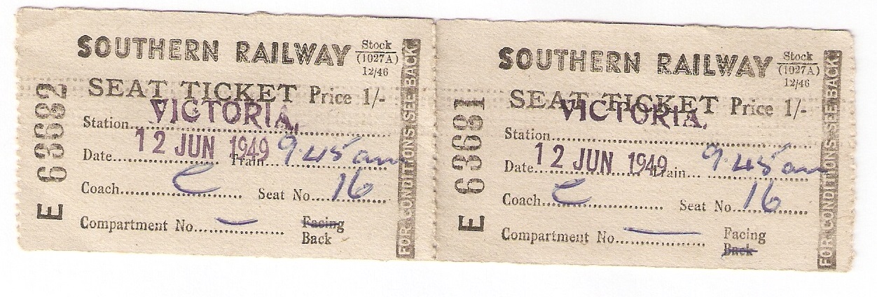 Then, a day later, onward tickets from Victoria, still issued by the Southern Railway. Nationalisation hadn’t quite got to Victoria yet, or more likely, who wanted to waste them in the post-war shortages in the UK….