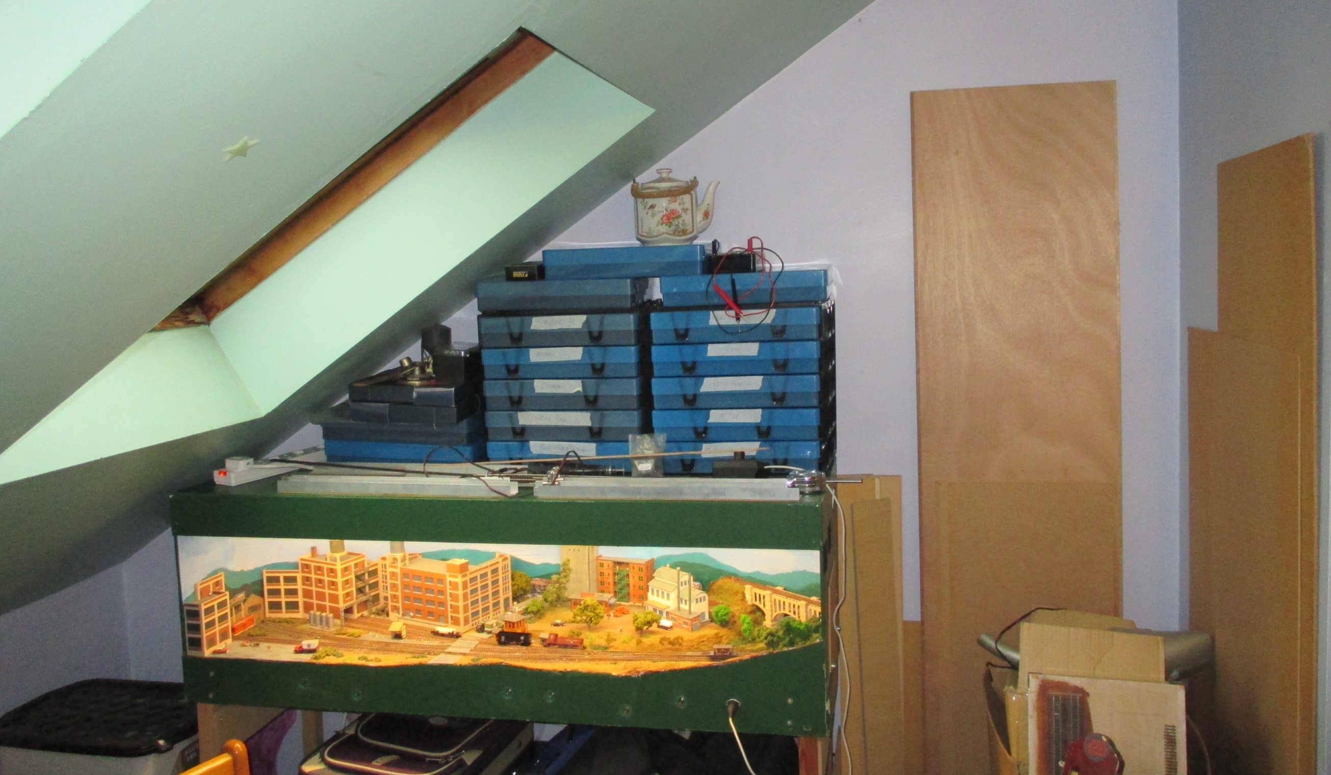 Next task is to complete the fiddle yard / staging on the layout, then paint out the boards brown, plan the scenery, and start ballasting. I’ve selected a number of buildings from my store of kits. And I’ll also try and tidy the remaining clutter in the loft…..