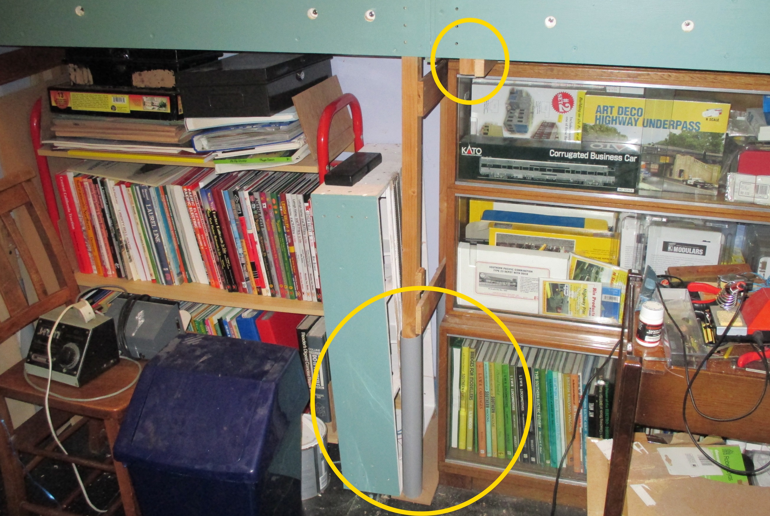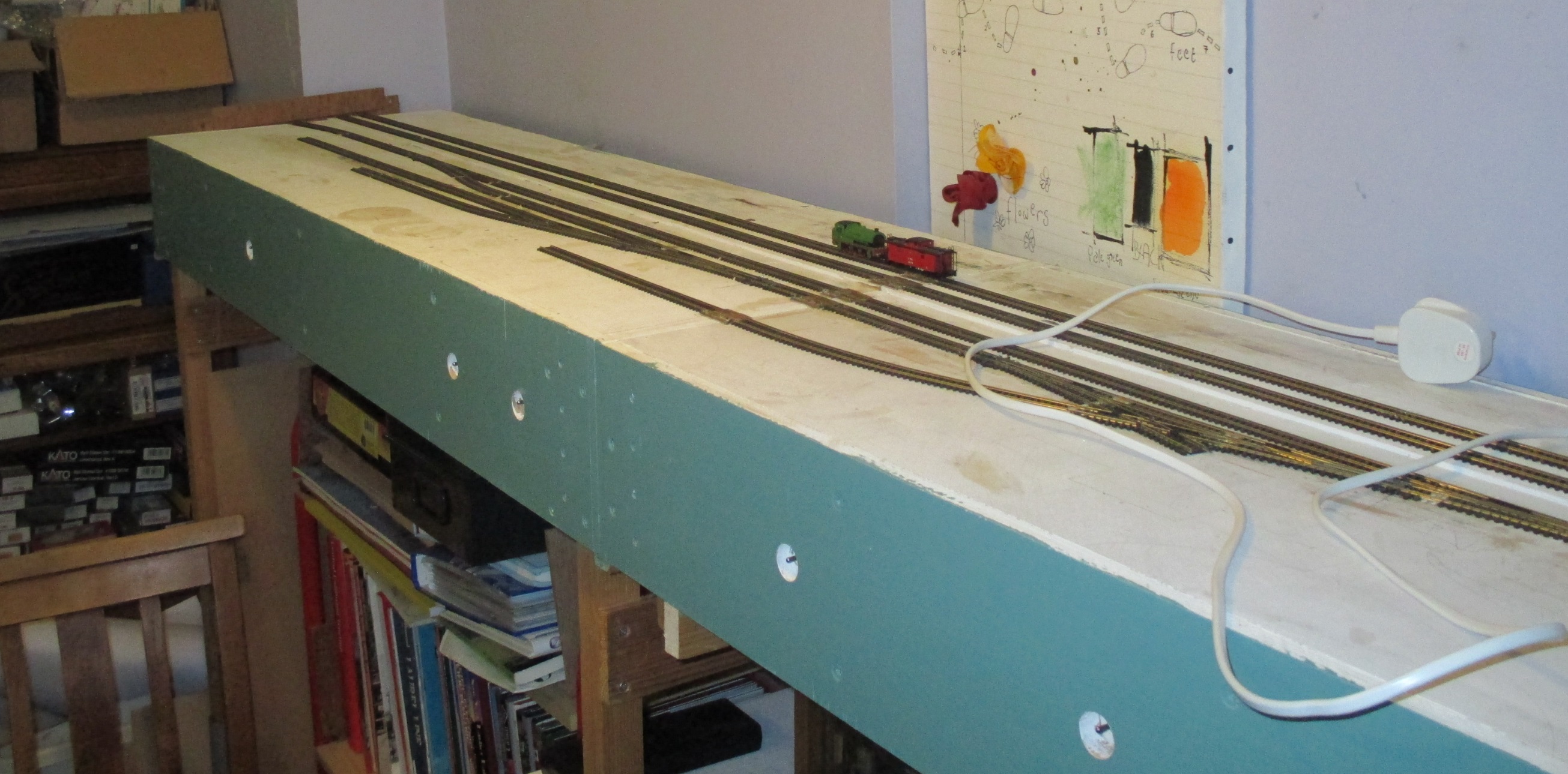 I then took a hacksaw to my ancient (a mere 29 years) MFI bookshelf to lower it to the same height as my other two (just post-war from my parents – we don’t waste anything in our house) bookcase. Circled in yellow below are the leg extensions that raise one N-club board. The other two are supported by brackets (also circled) that rest on the bookcases. the fourth module won’t quite fit along this wall, but tucks neatly between the furniture….