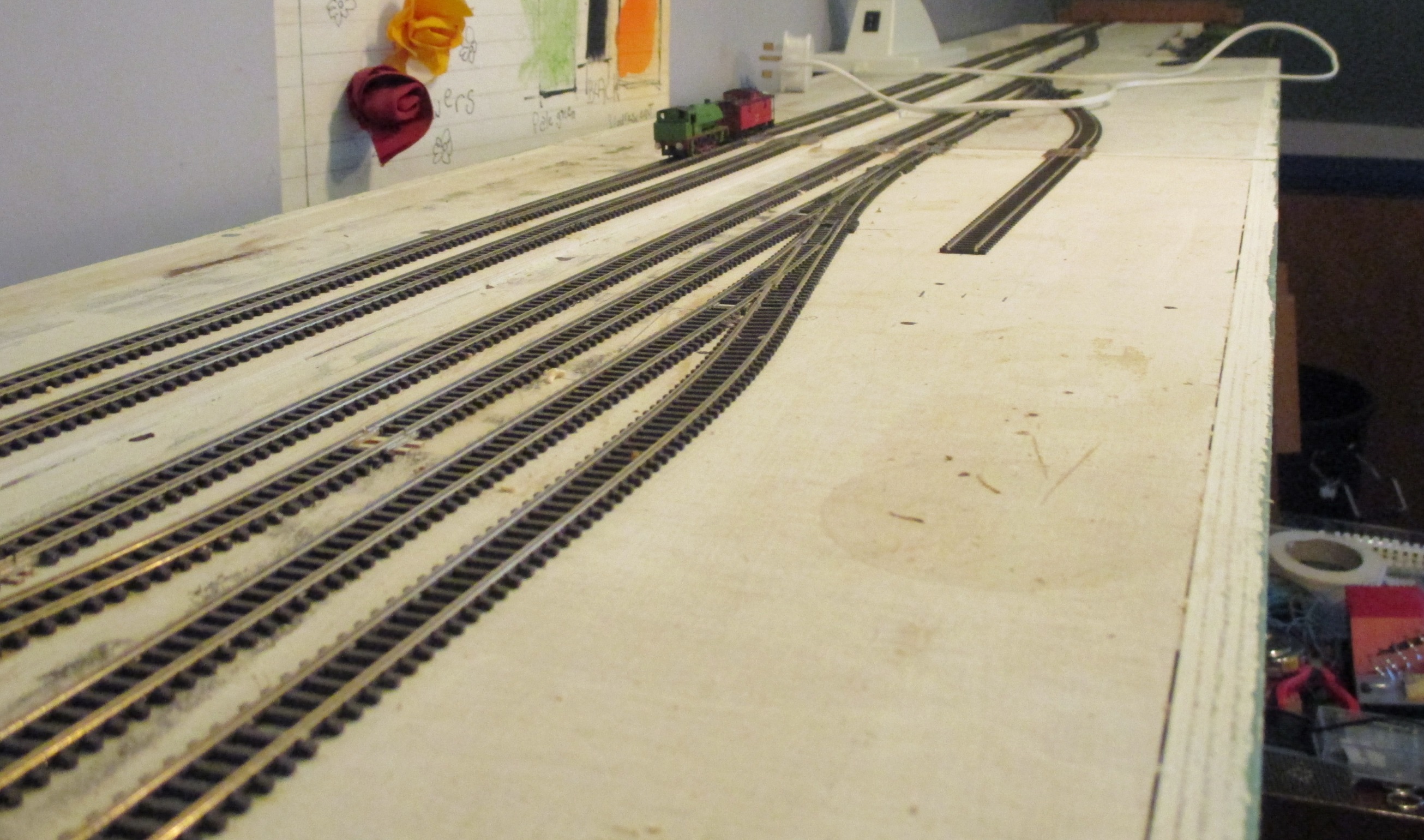 Then came a week’s procrastination, as I realised that the modules that I thought would fit across the end of the loft, wouldn’t really work like that. I was on holiday last week, and a lot of thinking and moving things about followed. Then the penny dropped. First task was to move Earl’s Wood across the loft to the alcove. I chopped 9″ off the high legs so it tucks under the sloping roof. This leaves 2′ to the right for a cassette fiddle year. In the process of moving, I reconnected a couple of broken wires under the layout, so it is all working again….
