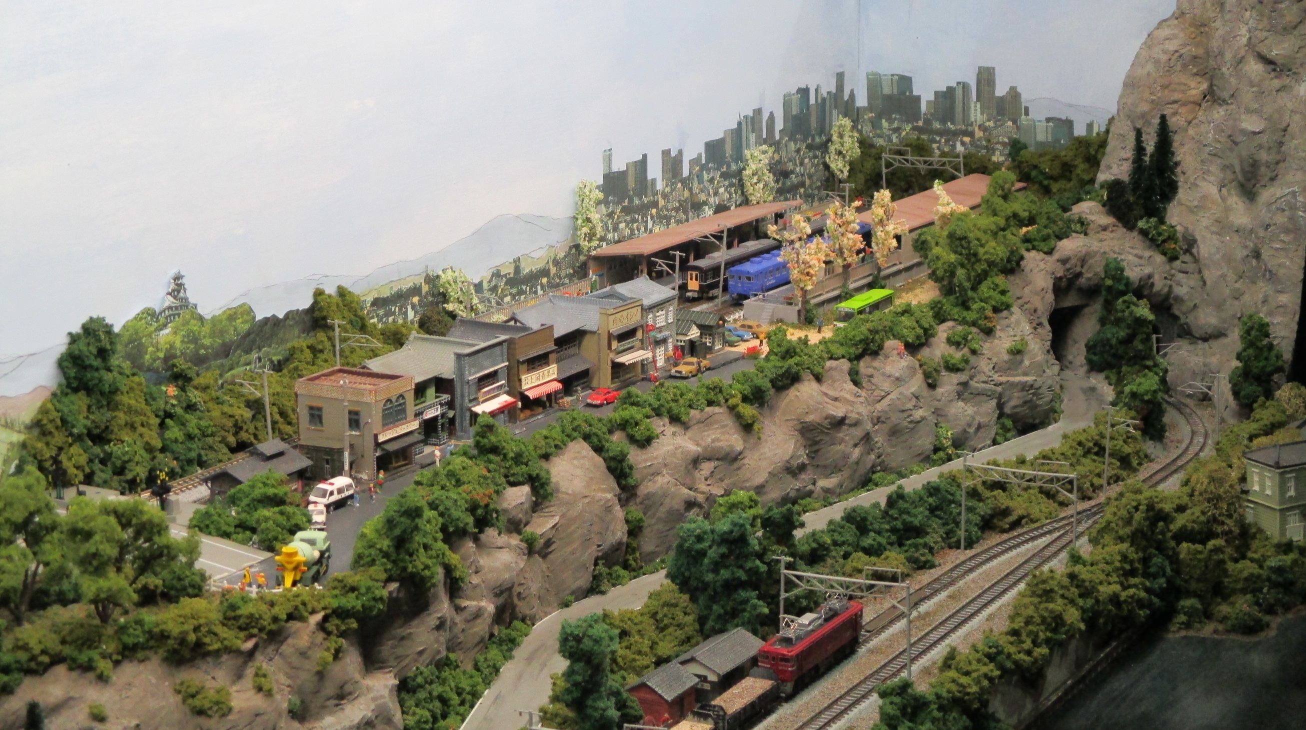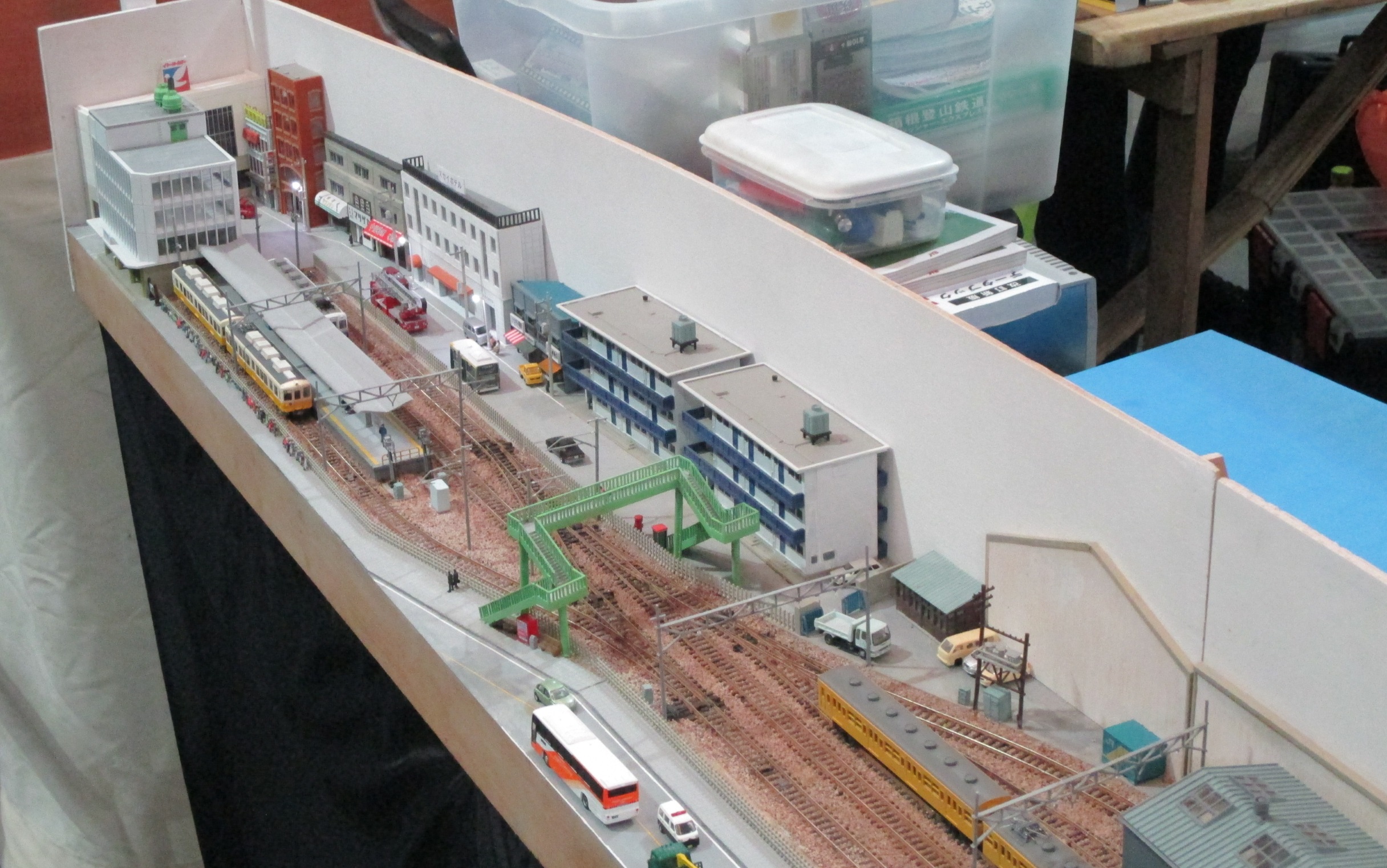Japanese layouts were well represented. Kanjiyama (not illustrated) was at our ESNG show a couple of years ago. Okurimono (below) was a two level line, with lots of interesting details in the scenery that made one forget the rather precipitous slopes! Hironocho (bottom) modelled a terminus of a Japanese light railway using EMUs and interurbans. A small, compact, layout, that gave me a few ideas for my future tram layout.