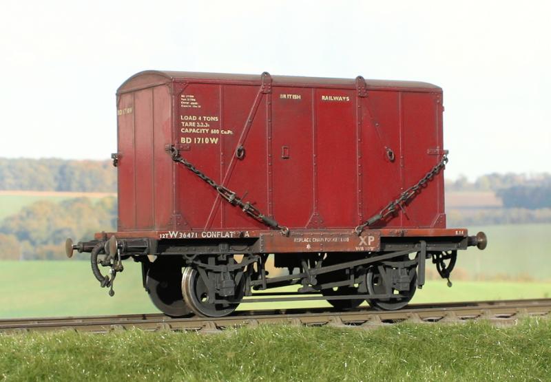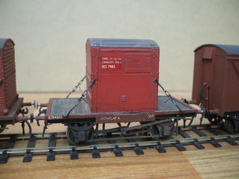 One purchase from TINGS I didn’t mention was a number of packs of etched container shackles and chain from N-Brass. I have a train of Conflats waiting for this finishing touch. A search on RMweb and Google came up with the following photos of model and real thing. The fixings look consistent enough. I did note that it was best to have only one small container on a wagon – two containers had to be roped together, then shackled from the ends. This may be just two difficult for me in N gauge….