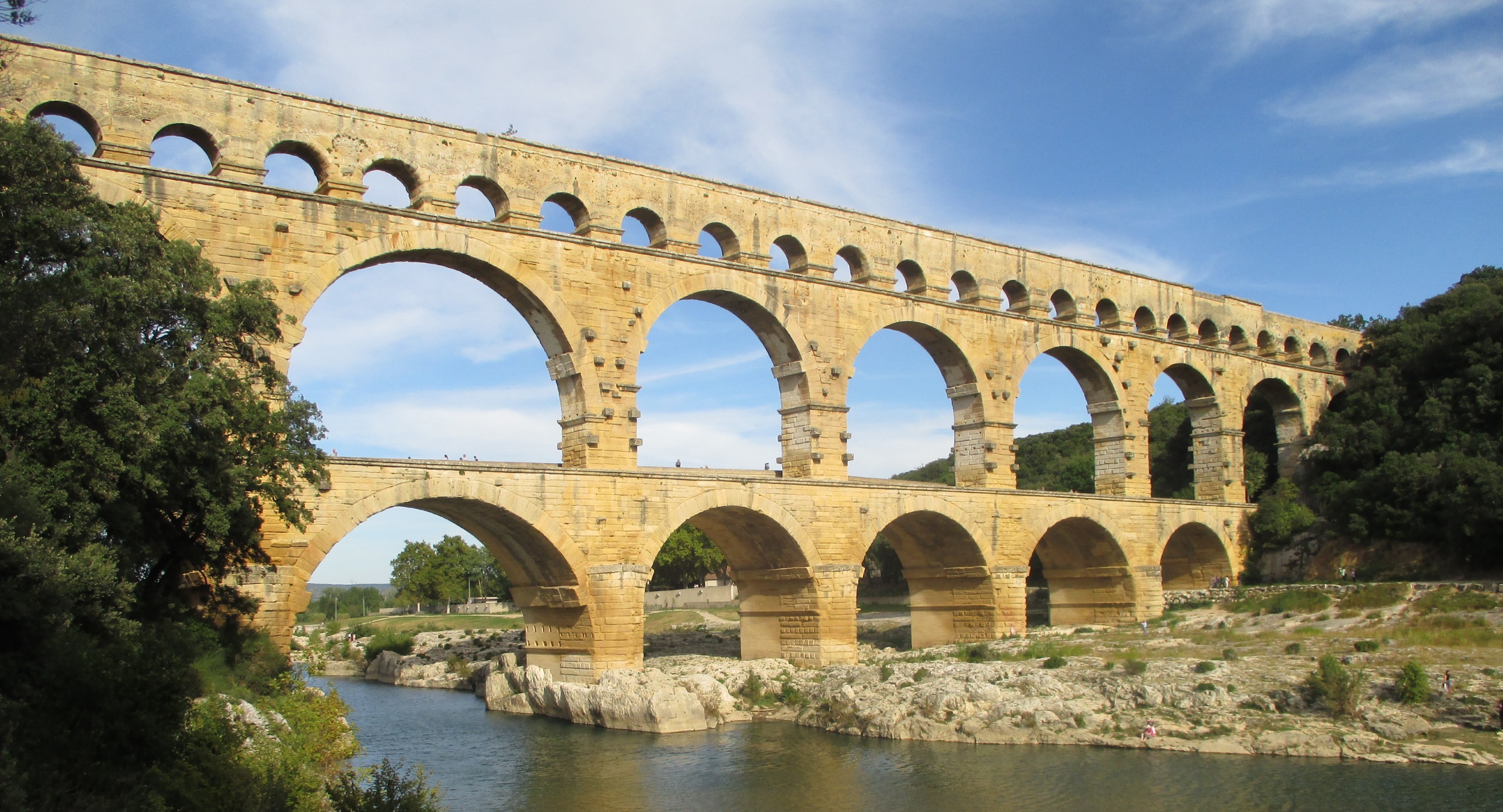 I did have a bit of a civil engineer’s busman’s holiday. That afternoon our friends took us over to the Pont du Gard, a beautifully preserved Roman aqueduct dating from the first century AD. It carried water for 50km from a spring at Uzès to the Roman colony of Nemausus (Nîmes). It’s also the highest Roman aqueduct, and a superb feat of engineering – not least the levelling required to get water to flow 50km downstream with a fairly even slope all the way.