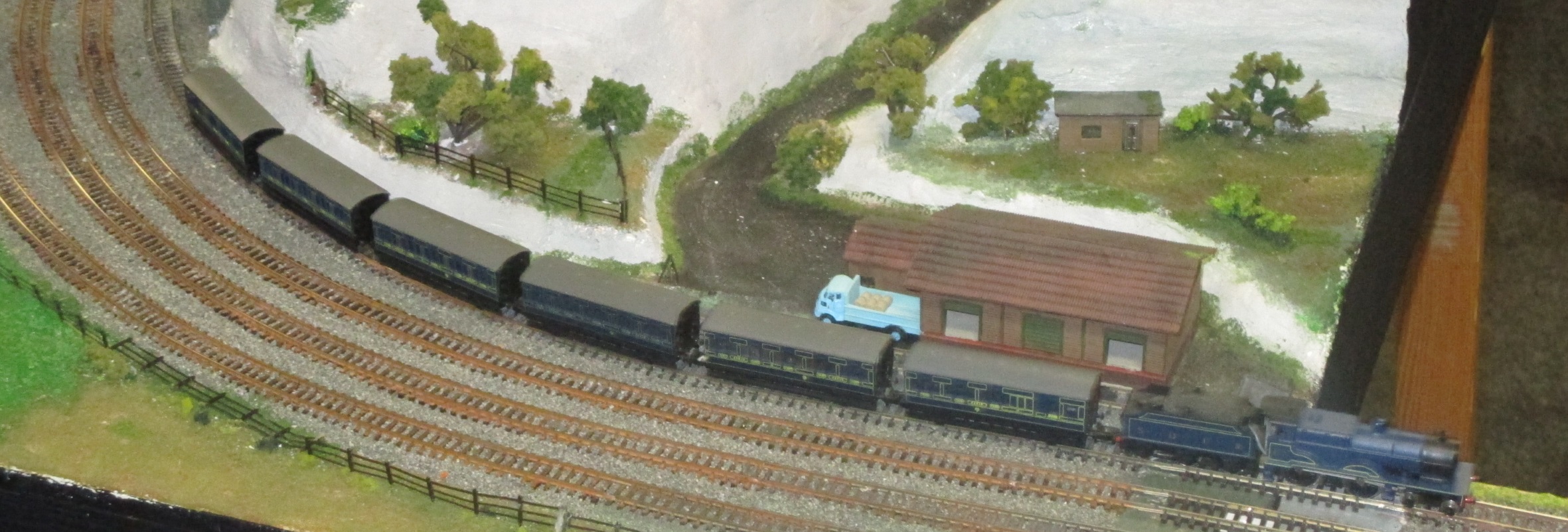 Derek had an old Graham Farish 4-4-0 and four wheel coaches in Somerset and Dorset Joint Railway livery. It ran very well for much of the evening without overheating or any other old Farish tricks. This blue livery always looks very smart, but the real interest in the line was it’s joint ownership between the Midland and LSWR, later LMS and Southern. This provided an eclectic mix of stock that makes a very good model. The line was closed, probably unwisely, during the 1960’s.