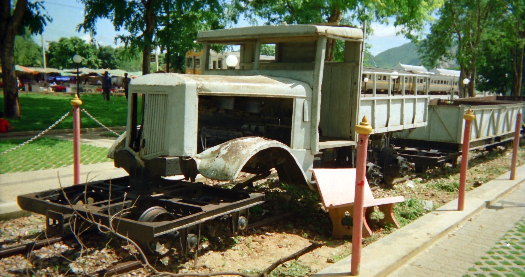 In 1997, I was working in Thailand, and took a weekend visiting the bridge over the River Kwai and the surrounding countryside. If I recall correctly, this is a rebuilt bridge, as the original that cost so many Allied soldiers’ lives, was bombed after completion. The bridge and a section of the Death Railway towards Burma is still open, as evidenced by the multiple units. The museum next to the bridge has some trains on display, as below.