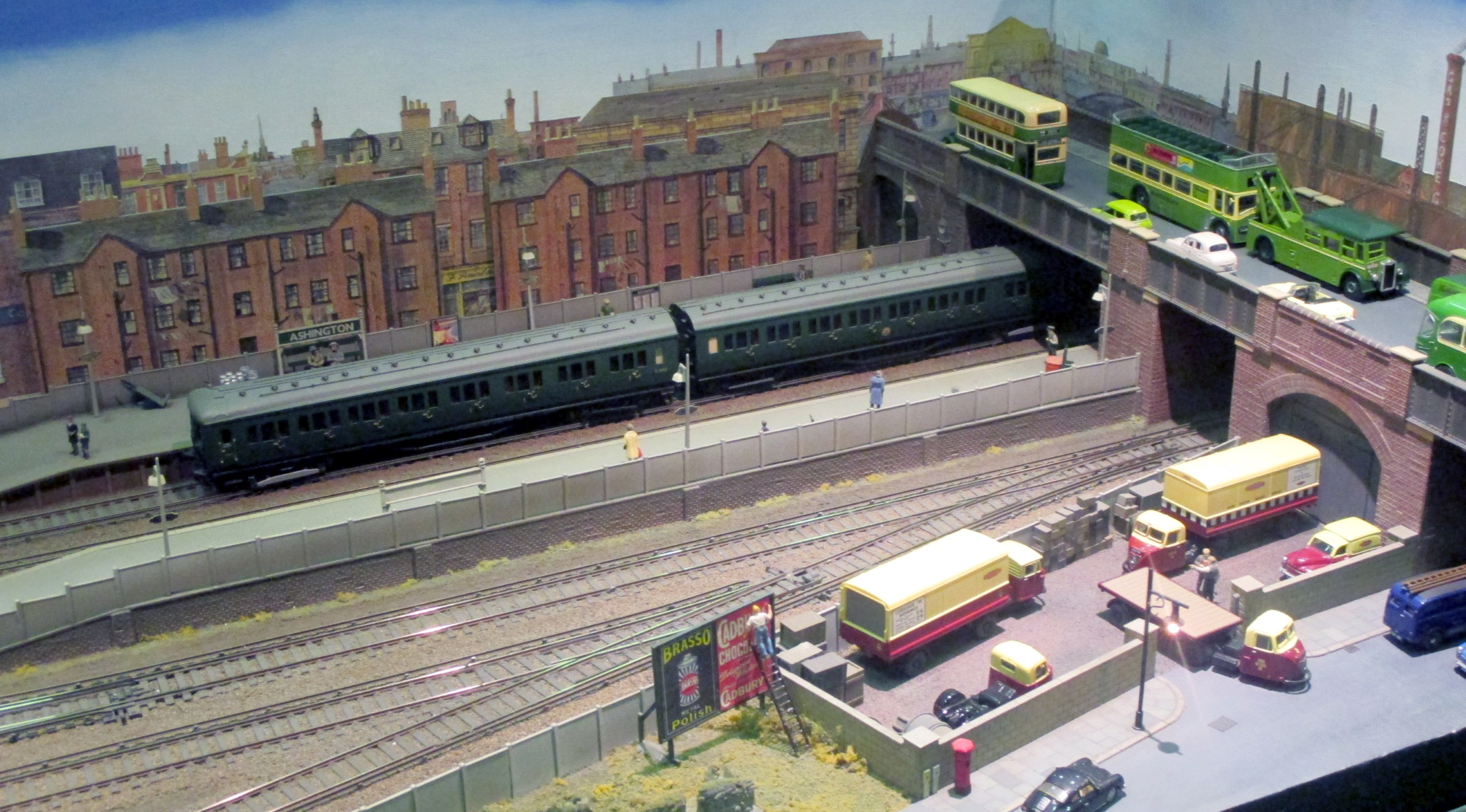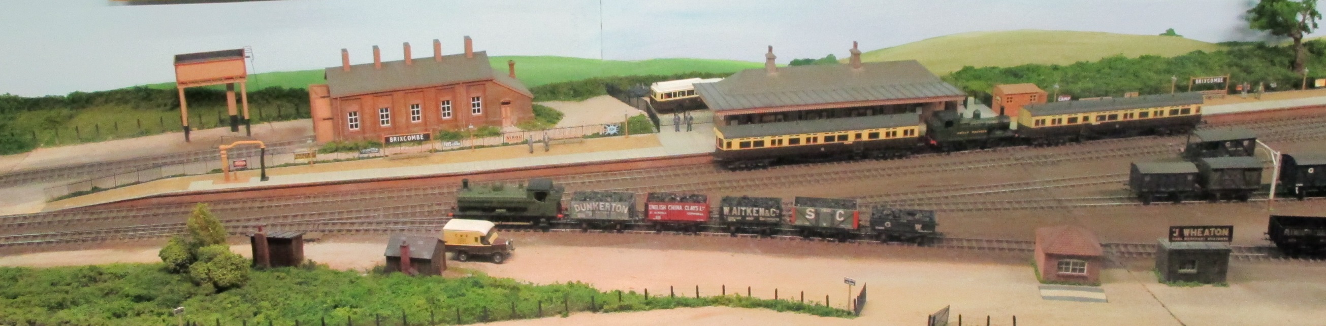 With a number of good ready-to-run models of Southern EMUs, and more kits, available, Southern 3rd rail layouts are becoming more common.  I’m delighted to see this, as I grew up deep in Southern Electric land.  Ashington is situated somewhere on the Sussex coast, as evidenced by the collection of Southdown buses in their classic livery on the road bridge.  Another attractive model of a workaday prototype.