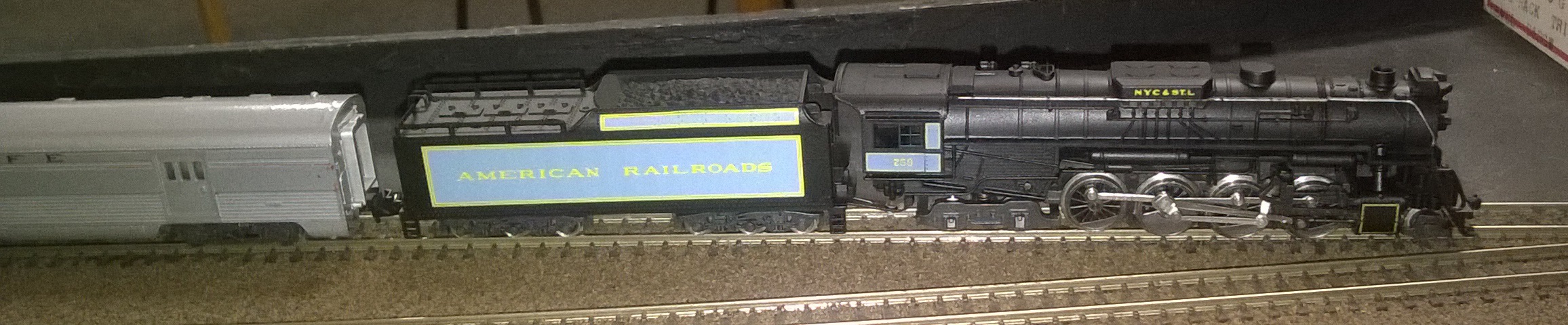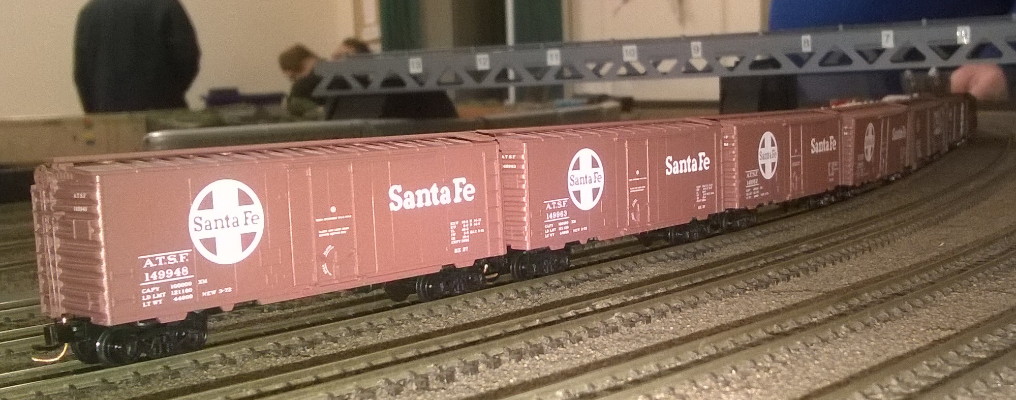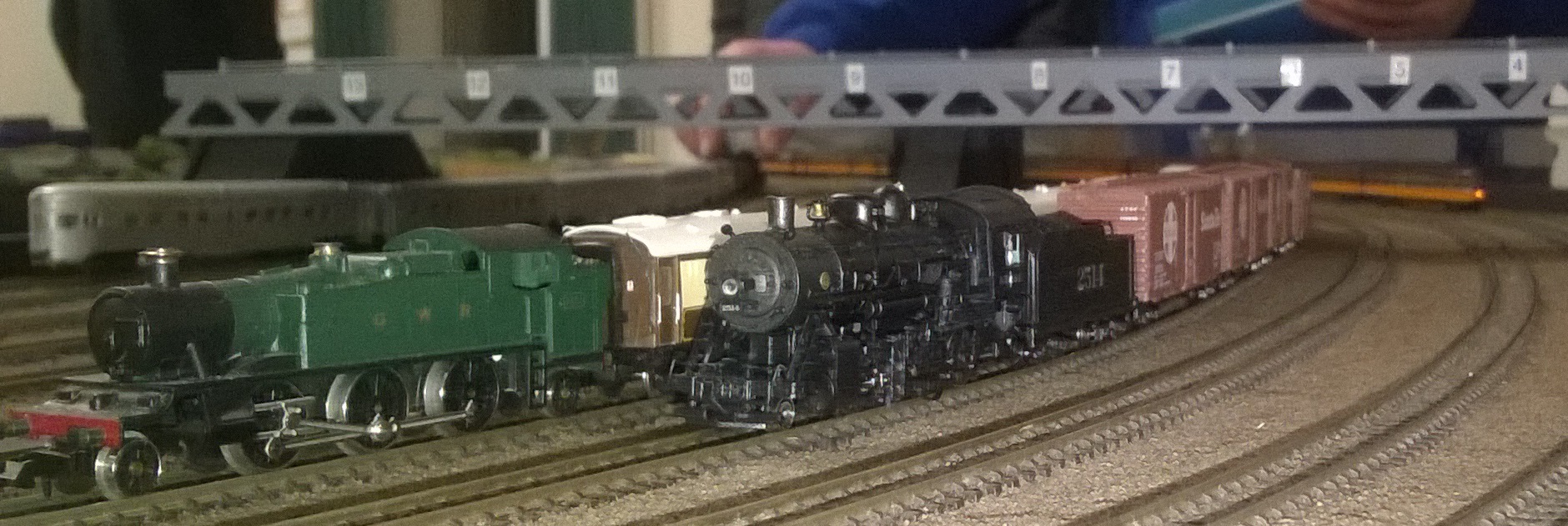 It was American night at ESNG, even without me contributing a train. Simon’s Santa Fe mixed train looked the part, and Grahams Kato Illinois Central rake (far right) was doing its usual high speed circuits.