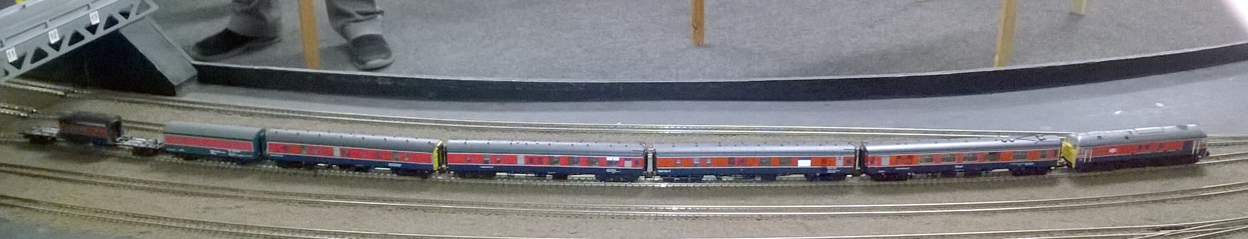 We had a very good turnout tonight, a dozen or so paying members. Good to see Paul back from Japan – with a suitcase of new Japanese goodies, including more bullet trains and Kato Uni-track. Also Sean and Martin – Martin enjoying his last day of paternity leave before getting back into the cab of his Eddie Stobart truck.