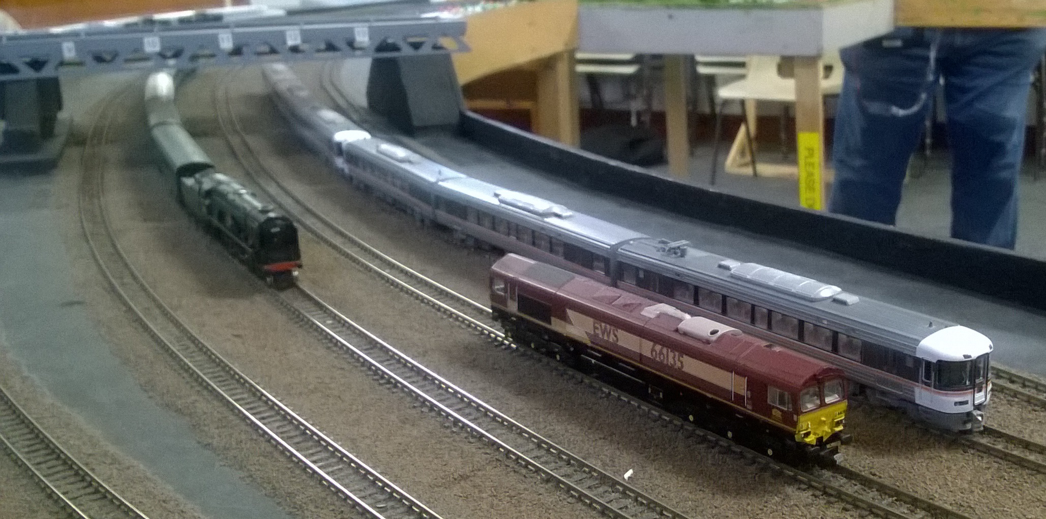 Lot’s of people and trains out tonight. We were testing a number of Martin’s locomotives. Perhaps the best item was his Merchant Navy ‘Clan Line’ and green Southern Region coaches.