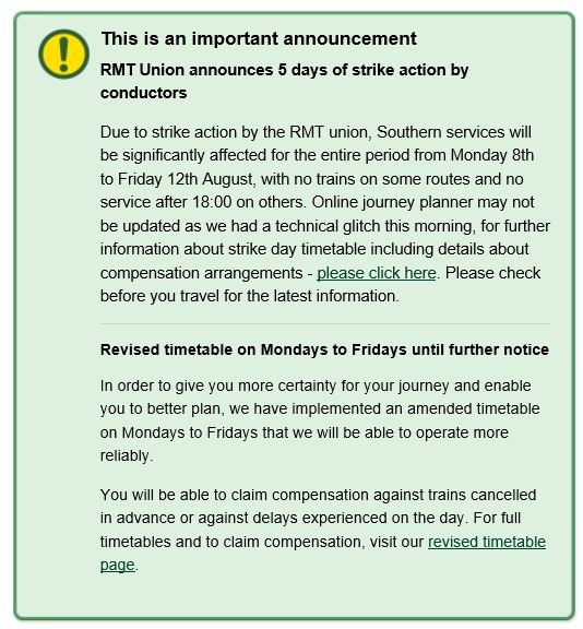 And a map shows a reduced service and closed stations. Our local station, Earlswood, has shut down, so I’ll get to Gatwick for a work trip by bus tomorrow.