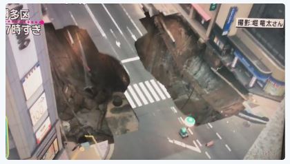 Residents of a major Japanese city woke up to a main road being swallowed up on Monday. A large sinkhole opened up around dawn in the centre of Fukuoka, on Japan’s southern Kyushu island, with all five lanes of a street caving in.