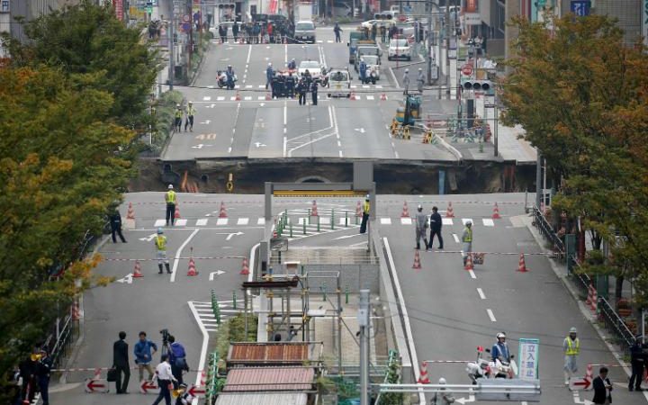 Located at the intersection of a busy road near a train station, the collapse, which occurred just after 5am, caused no casualties but resulted in evacuations, traffic disruption, gas leaks and electricity blackouts, according to Kyodo News. Residents reported that electricity suddenly cut in nearby buildings before they heard a loud noise as the road began to cave in on itself shortly before sunrise.