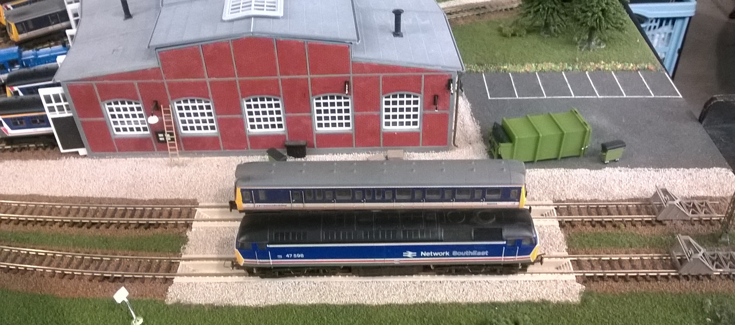 ‘ERIC’ went Network Southeast for the show, giving Sean an opportunity to show off all his models. The stripy blue livery was one of the better on to grace UK rails in recent years, although it was possibly subliminal advertisement for a well known brand of toothpaste. We cheated a bit and split up the multiple units to fill two of the roundhouse tracks….