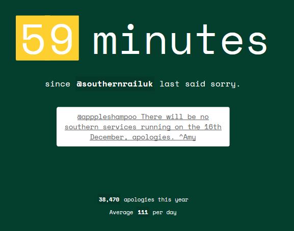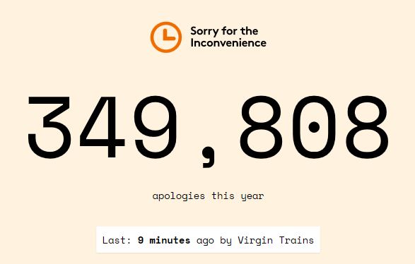 The site logs each time an operator’s Twitter account says “sorry” or “apologies” in response to disgruntled passengers.