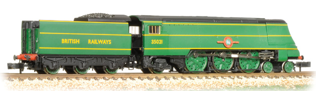 I had plucked up courage and tested the Farish unrebuilt Merchant Navy Pacific that I bought new at less than half price at a collector’s fair. It seems to run fine. The coal is missing from the tender, but that’s easily fixed with the real thing. I’ve borrowed the photo below, as my camera didn’t take any decent shots of the model. This livery was very transitory – Southern malachite green with British Railways lettering and number, but it looks very attractive.