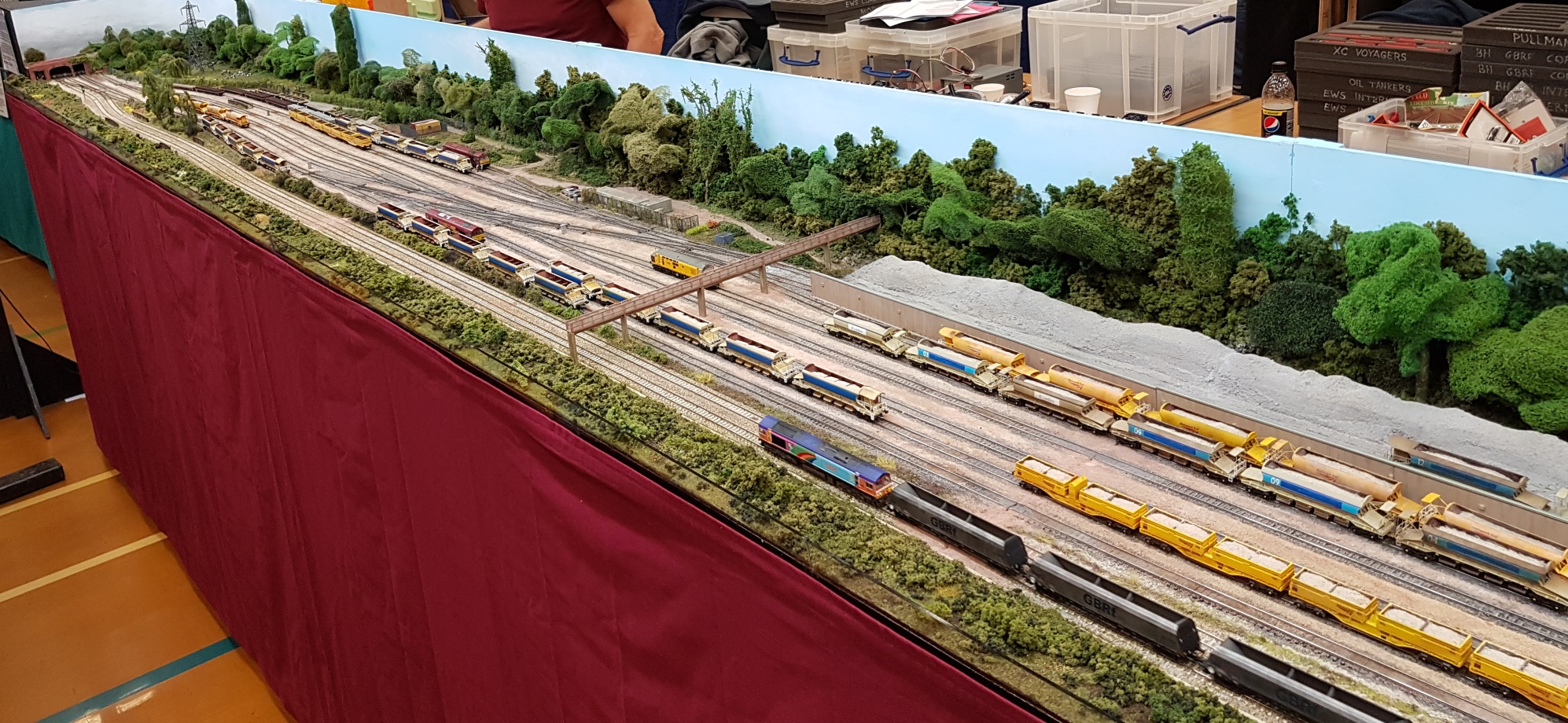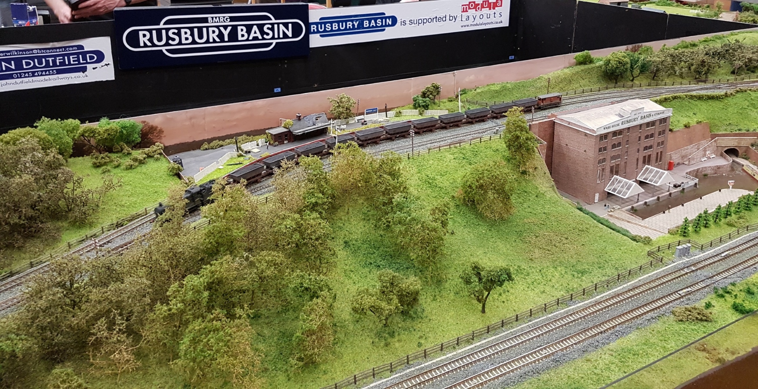 Today, I’ve got some pictures of some of the ‘N’ and other small scale trains.  Next post will have the larger exhibits.  We start with Rusbury Basin, layout with two double track main lines at different levels, giving the chance to run four trains through the attractive countryside.  The two main lines are perhaps more interesting than our N-mod system, but a bespoke layout like this can be free of modular conventions.