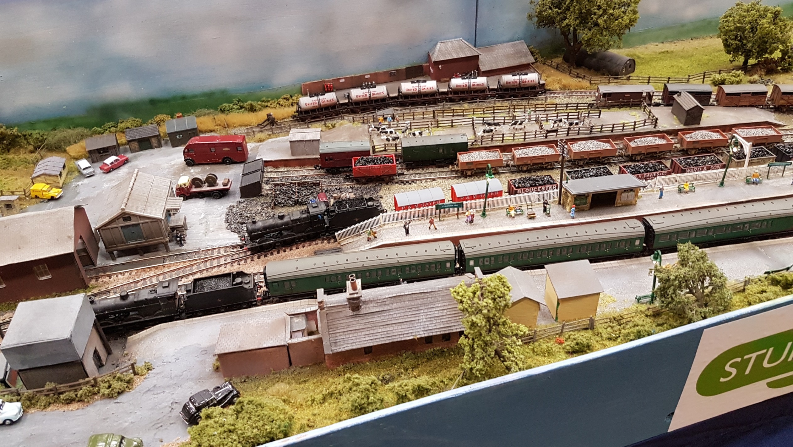 Sturminster Halt is a fairly small 8′ x 2′ layout, representing the Somerset and Dorset Railway.  The sense of location is very strong, with ex-LMS 4F 0-6-0’s pulling ex-Southern Railway coaches, and a milk depot in the background.
