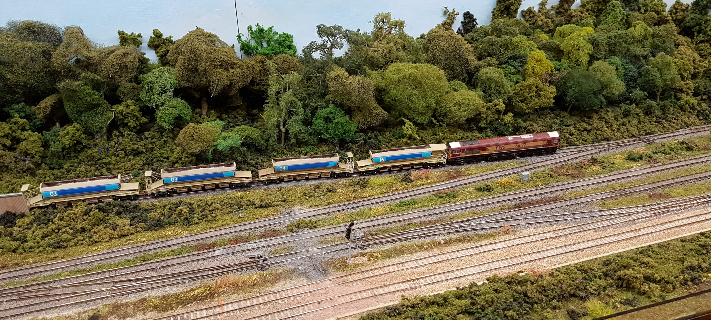 Hinksey Yard shows 18′ of the main line just south of Oxford.  It’s a DB Schenker (EWS) ‘virtual quarry’ for distributing ballast for engineering works.  The main line allows a wide range of trains to pass whilst shunting continues in the background.