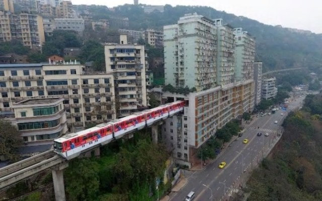 The unusual train track passes directly through the 19-storey residential building in the “emerging mega-city” of Chongqing, located in the south-west corner of the East Asian nation.