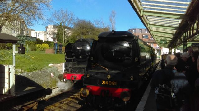 Bit hectic at the moment, so here’s a picture from Mr Dawes of Swanage in the sun, with two Bullied Pacifics in Swanage station.