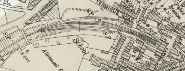 Cowes is a slightly larger terminus, but makes an attractive curved terminus. Early drawings and photographs of the station show that the line used to end more or less at the footbridge, and the two cul-de-sac’s shown either side of the platforms were originally one road, cut by the station extension. Cowes was a busy station, with services from the island railway hub at Newport.