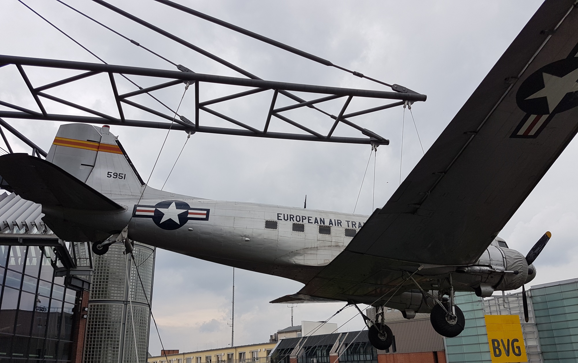 Whilst approaching it, this DC-3 Dakota is seen on the roof of the building.