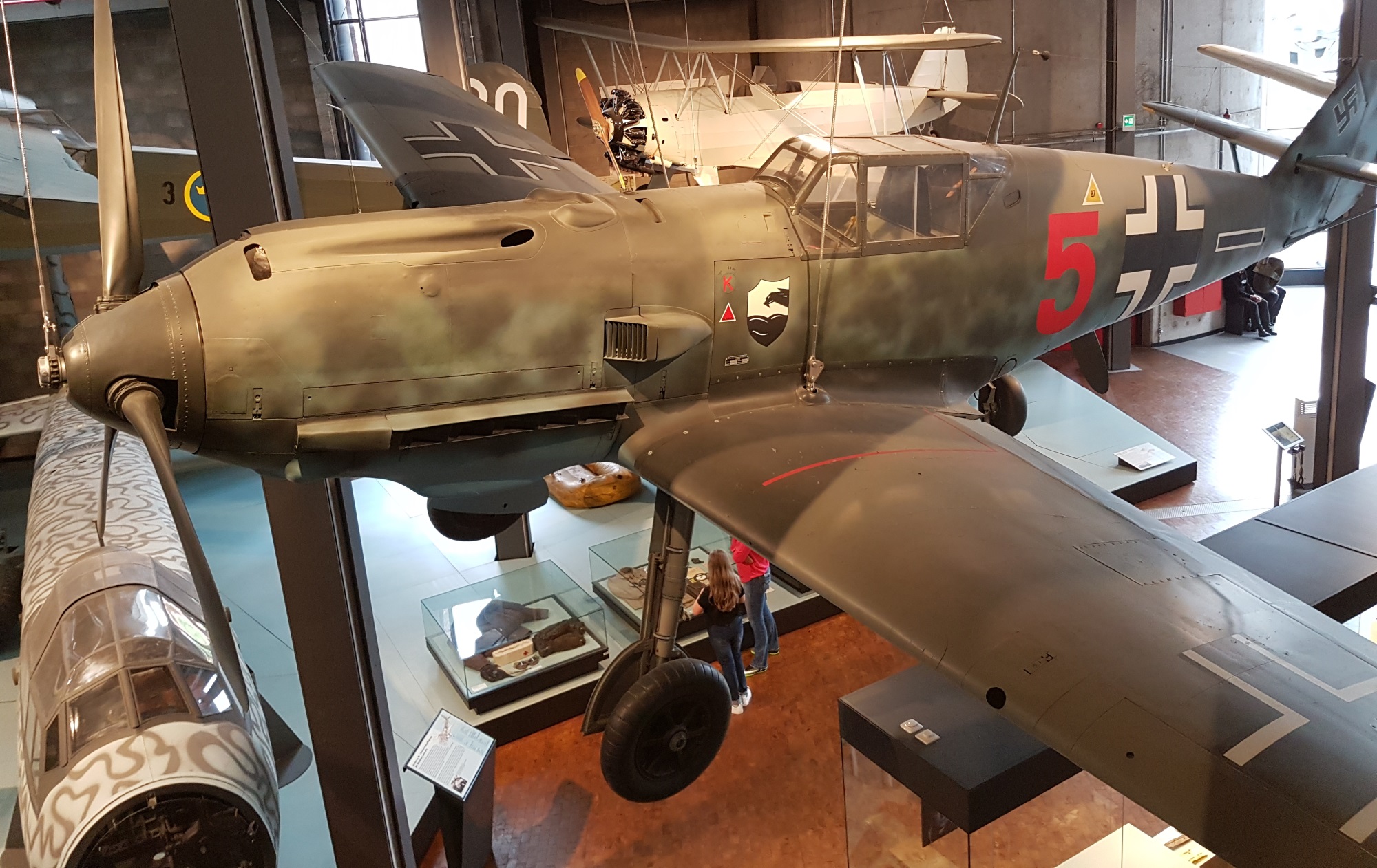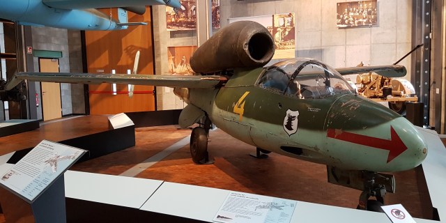 The Heinkel He 162 Volksjäger was a simple, mainly wooden, jet fighter built late in the war. The design was intrinsically sound; problems came from shortage of materials and poor standards of construction. A V1 flying bomb is displayed to its left.