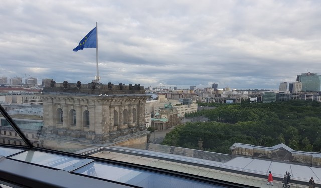 Once in the Reichstag dome, there was a chance to admire the views and the interesting structure of the dome itself. It’s a real model railway helix, with a spiral up to the top and a differenct spiral back down again. Having got to the top, and looked through the side windows, it was a surprise that the roof itself is open.
