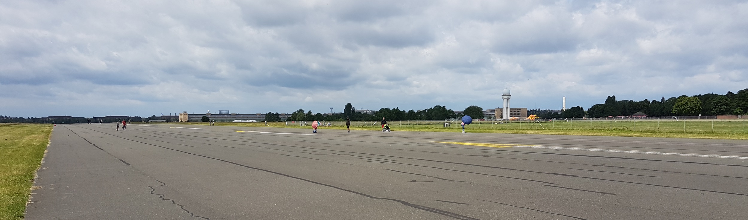 After brunch, a walk down the runway at Tempelhof to work off some food. The terminal building here, that is so big it’s difficult to photograph, lies somewhere in the distance, for more than half the width of the photograph. I understand that it’s still one of the largest structures in Europe. The airfield is well used, with dog walkers, kite flyers, skateboarders (with and without ‘sails’) and cyclists. Part of it has been fenced off as a nature reserve and is full of skylarks and the air is full of their lovely song.