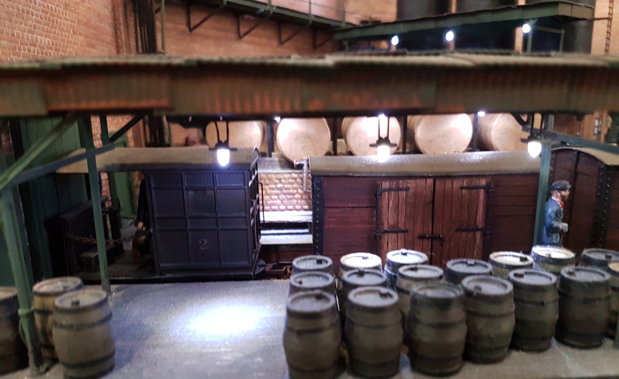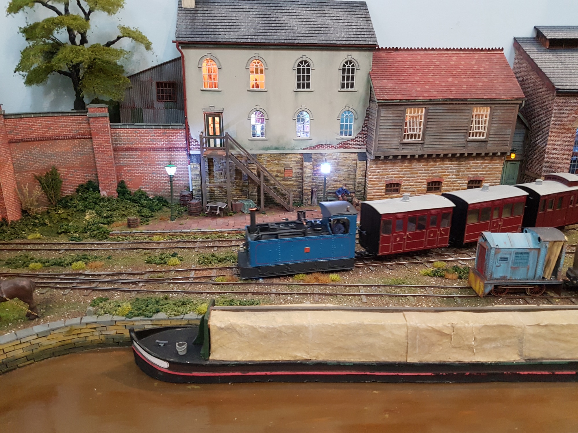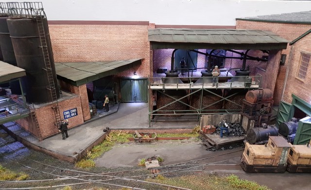 Most of the remaining layouts were narrow gauge, in various scales, and they were a fine selection of models.  We start with Cuttinglye Wharf, O-16.5 narrow gauge, set in the 1930’s to the south of London.  In this larger scale, the well lit interiors of the buildings showed up well.