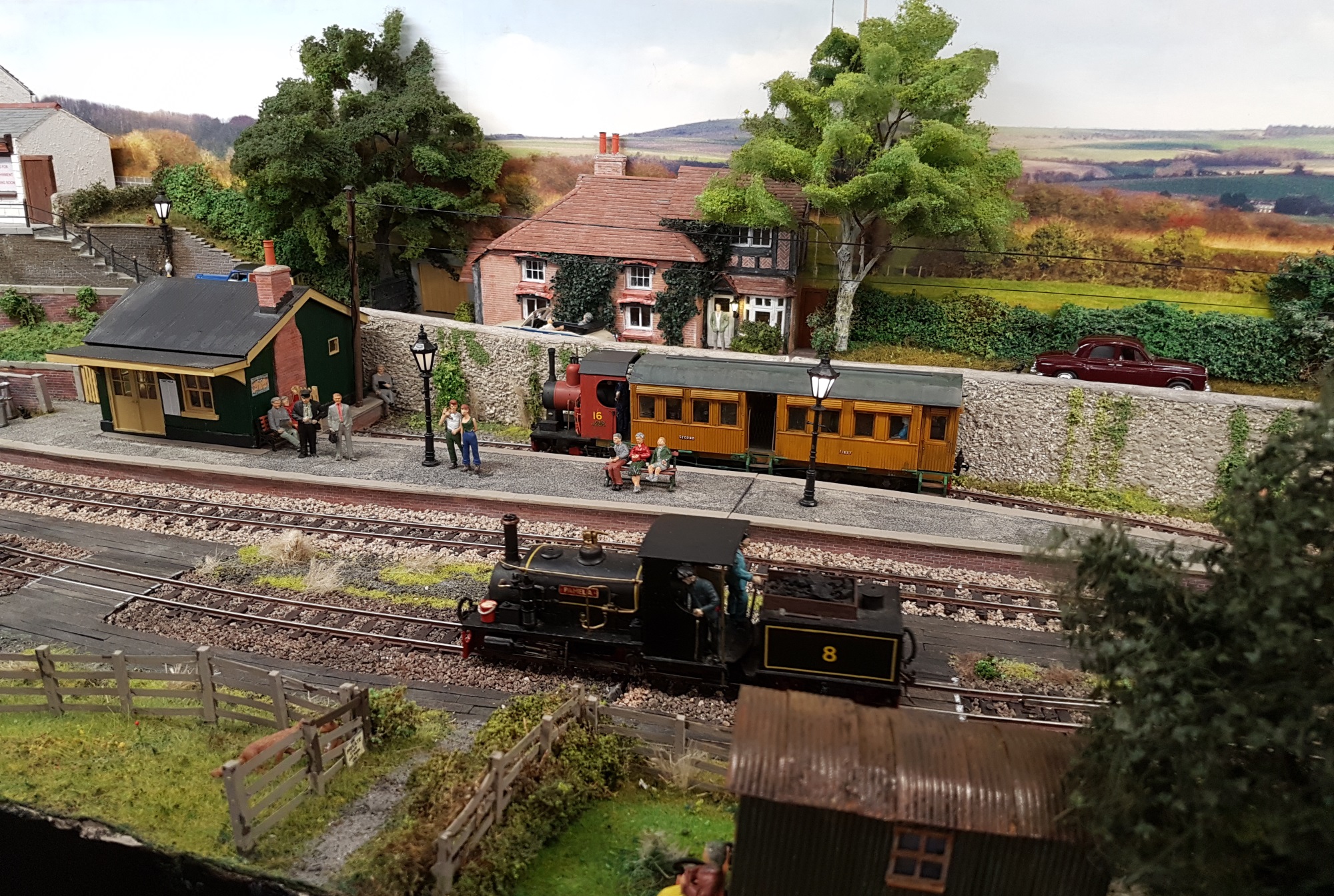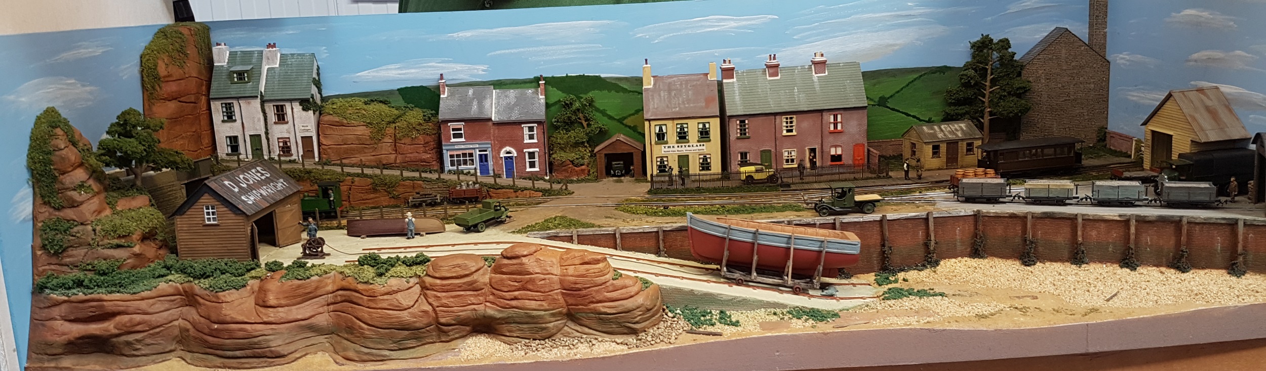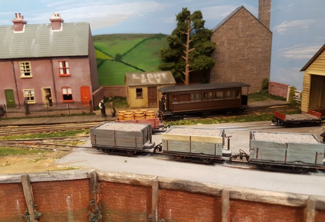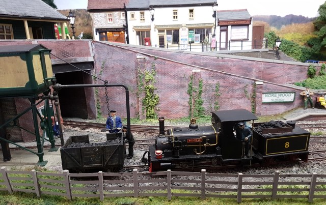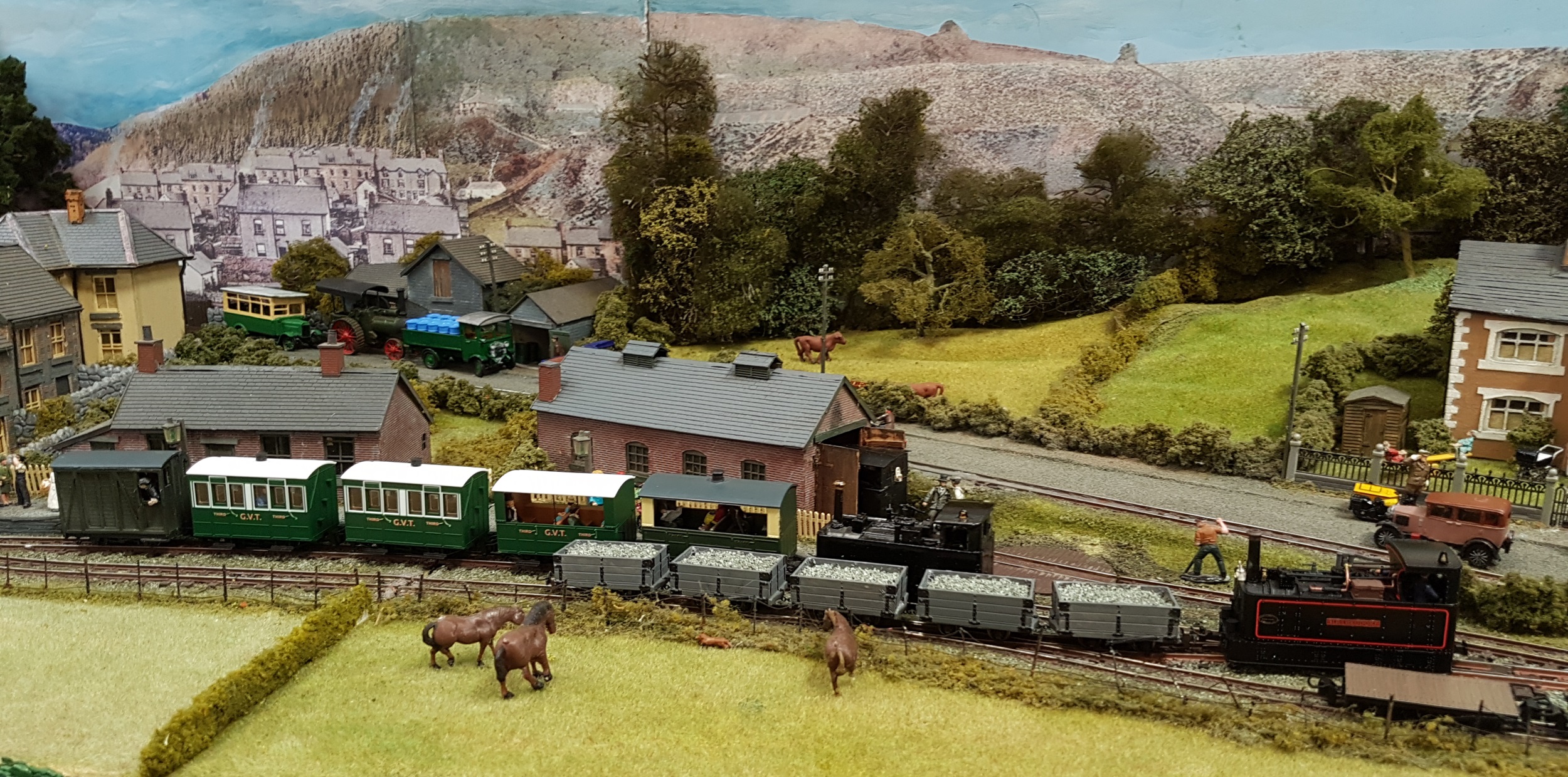 Moving down in size to OO-9, the Glyn Valley Tramway is a compressed model of Glynceiriog station, that was the terminal for passenger trains.  I recall building a cardboard model in O-16.5 in my early teens that fitted onto a Hornby-Dublo wagon chassis.  Long departed, but I recall it was a reasonable model, with cotton beading based on a method described in the seminal Don Boreham book on narrow gauge modelling.