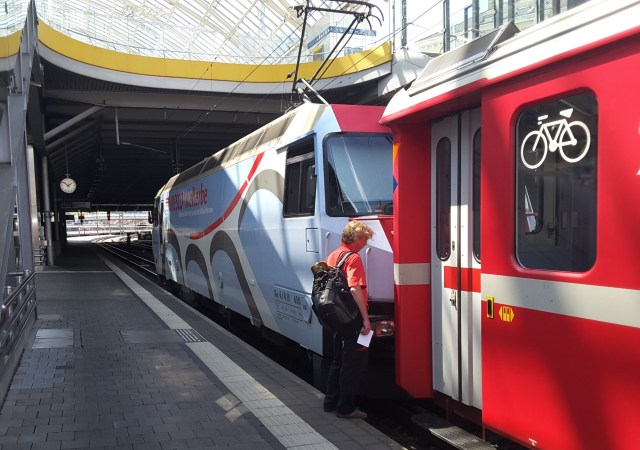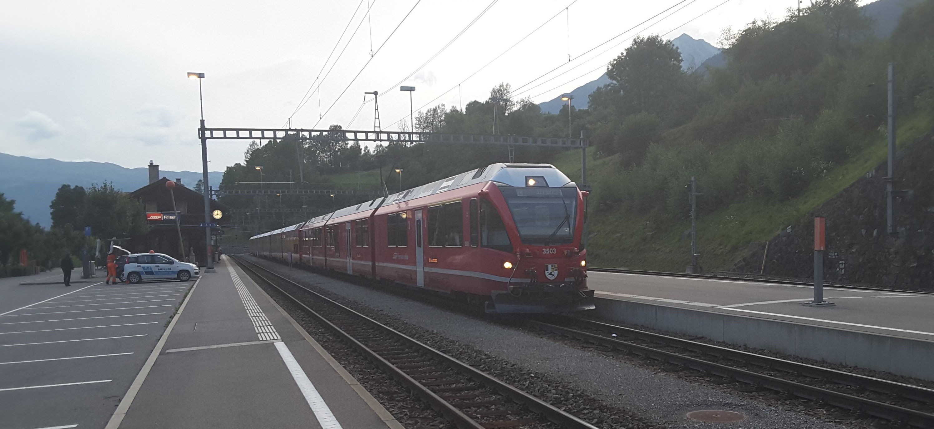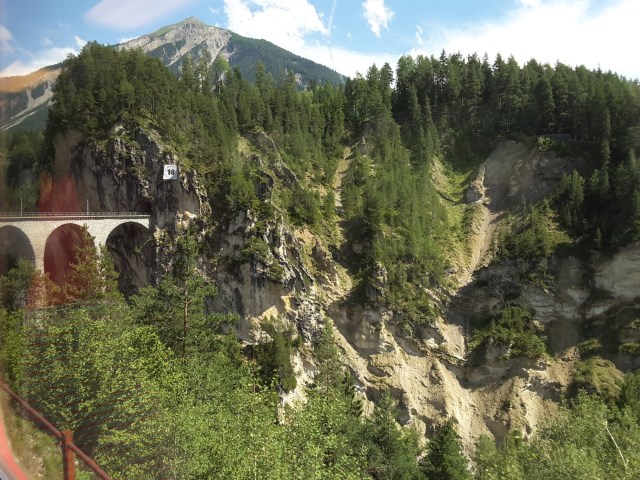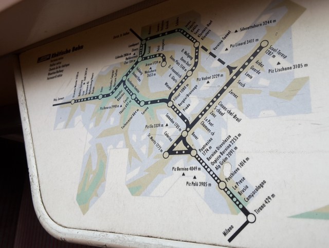 Views of two RhB trains at Chur, the table network map, the Landwasser viaduct from train and a train in the 20:00 meet at Filisur.