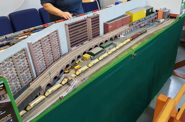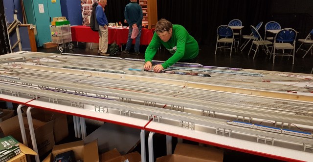 Paul had his Kato Racetrack on display, in a bigger and better format. However, no-one gave him any tables and he was running late with the setup. Fortunately, by the time I left, trains were on the move.
