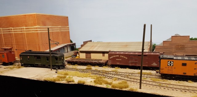Now for some old favourites.  Wiley City, in ‘HO’ is Andy Gautrey’s minimum space but fascinating model of the Yakima Valley interurban line, in Washington State, USA.  The overhead works, and power is through the trolley poles.  When I was there, they were attempting some ‘pole shunting’ – pushing a boxcar on the parallel track using a baulk of timber.  And it worked…..